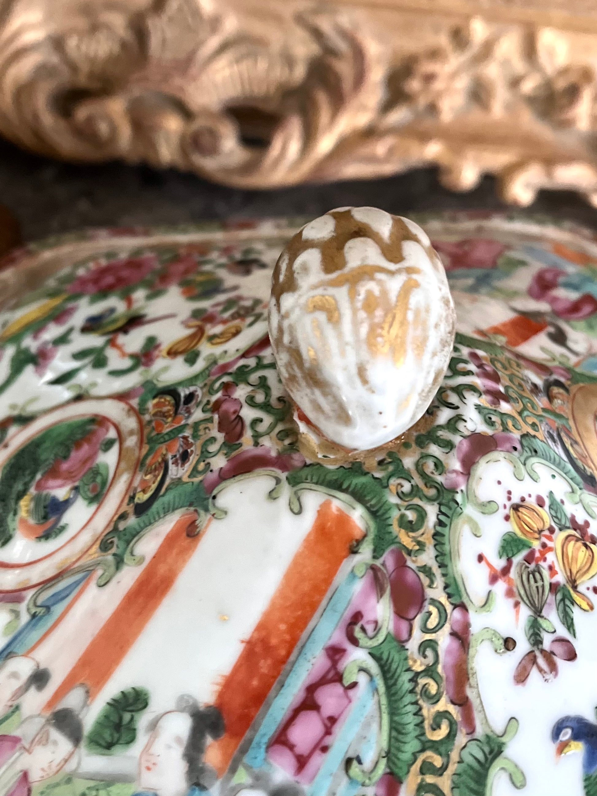 Make a statement with this exquisite 19th-century Rose Medallion covered dish — a richly hand-painted blend of court figures, florals, birds, and butterflies framed in gilded scrollwork. And the best part? The rare celadon interior that instantly sets it apart from standard pieces and makes collectors perk right up.
