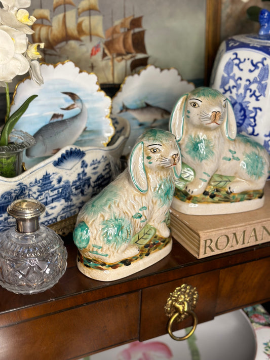 Danny's Fine Porcelain: Ceramic Bunny/Rabbit Figure Pair, Green & White, 8x4x7" - Pristine!