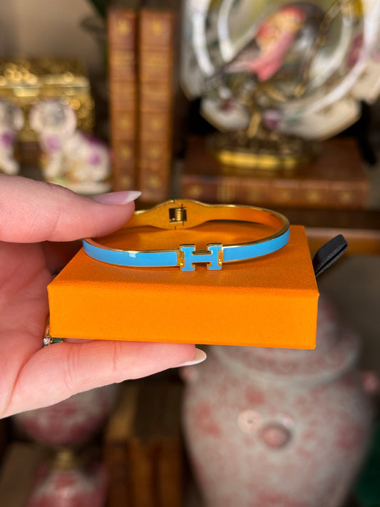 Turquoise Enamel “H” Gold Hinged Bangle Bracelet