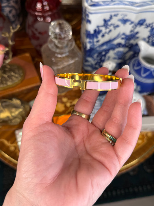 Pink Enamel “H” Gold Hinged Bangle Bracelet W/ Box
