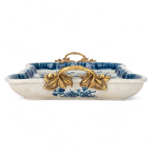 Danny’s Fine Porcelain | Blue & White Songbird Garden Tray with Bronze Handles – 15” x 8.5”