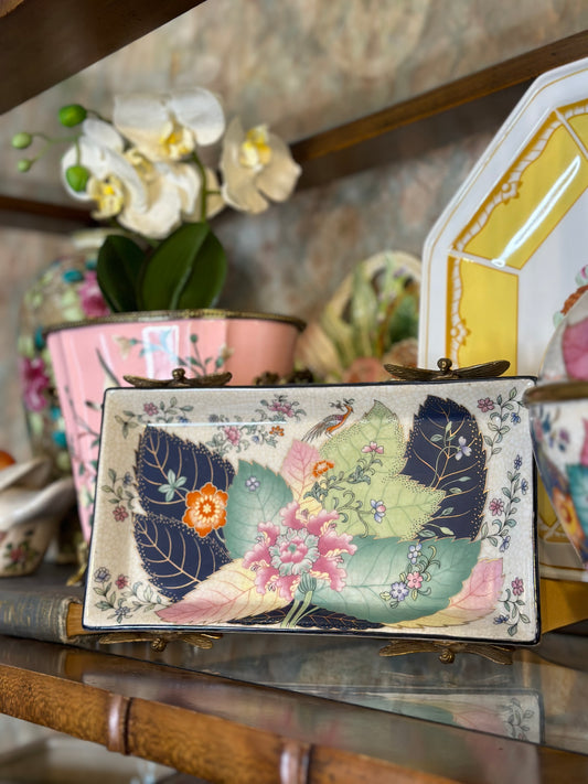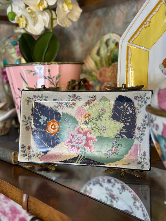 Danny’s Fine Porcelain - Yellow Hand-Painted Chinoiserie Porcelain Tray with Birds & Blossoms
