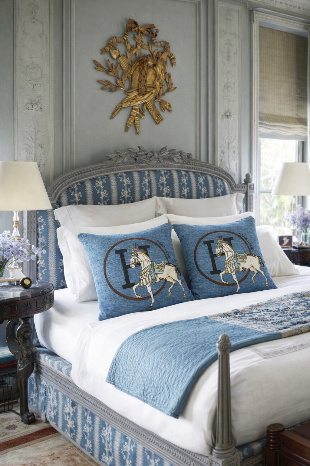 Luxury Equestrian “H” Square Horse Pillow W/ Down Insert – Blue, 18x18”