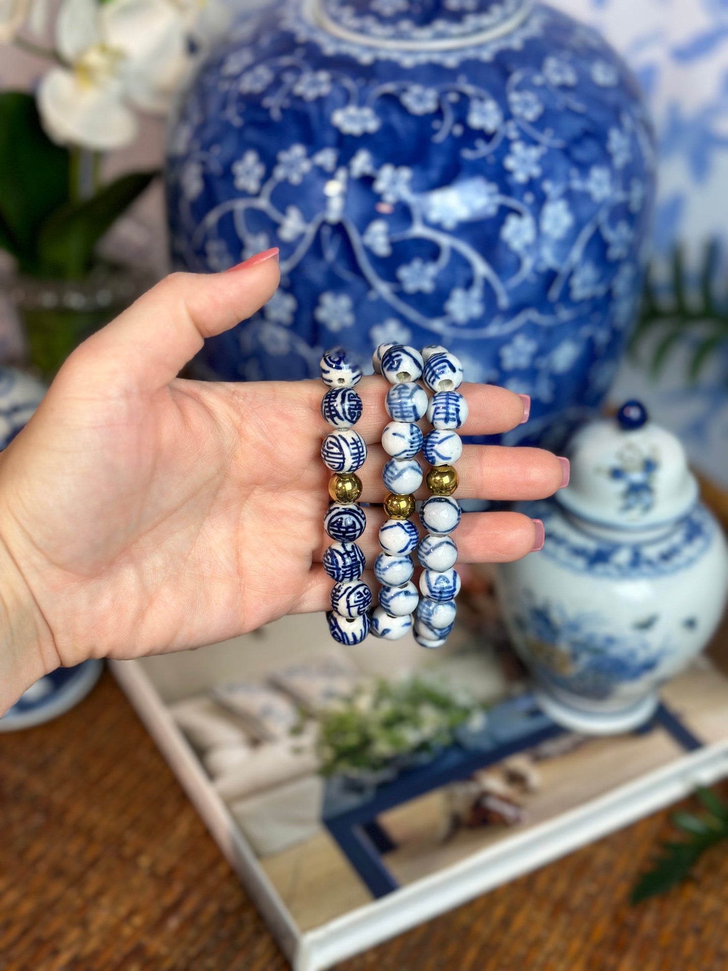 This unique Blue & White Chinoiserie Stretch Bracelet is made with a high-quality stretch band and is adorned with hand painted blue and white chinoiserie beads. Designed and crafted in the USA, this bracelet is a great addition to any arm party collection