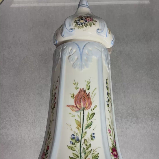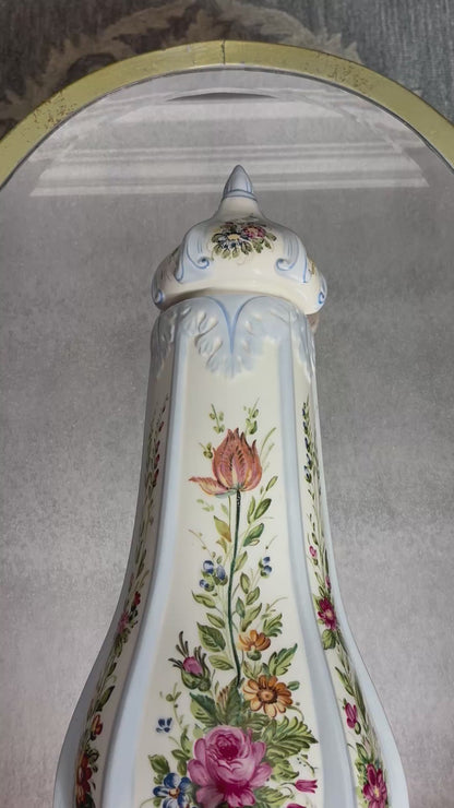 This exquisite 3-piece Vintage Hand Painted Lavabo by Andrea Sadek offers an unforgettable design! The ewer stands tall at 16", with a width of 8.5" and depth of 5". The accompanying lid is 5.25" tall, 5" wide and 2.5" deep while the basin is 6.5" tall, 11" wide and 5" deep. A small repair on the back of the lid is not visible when hung.