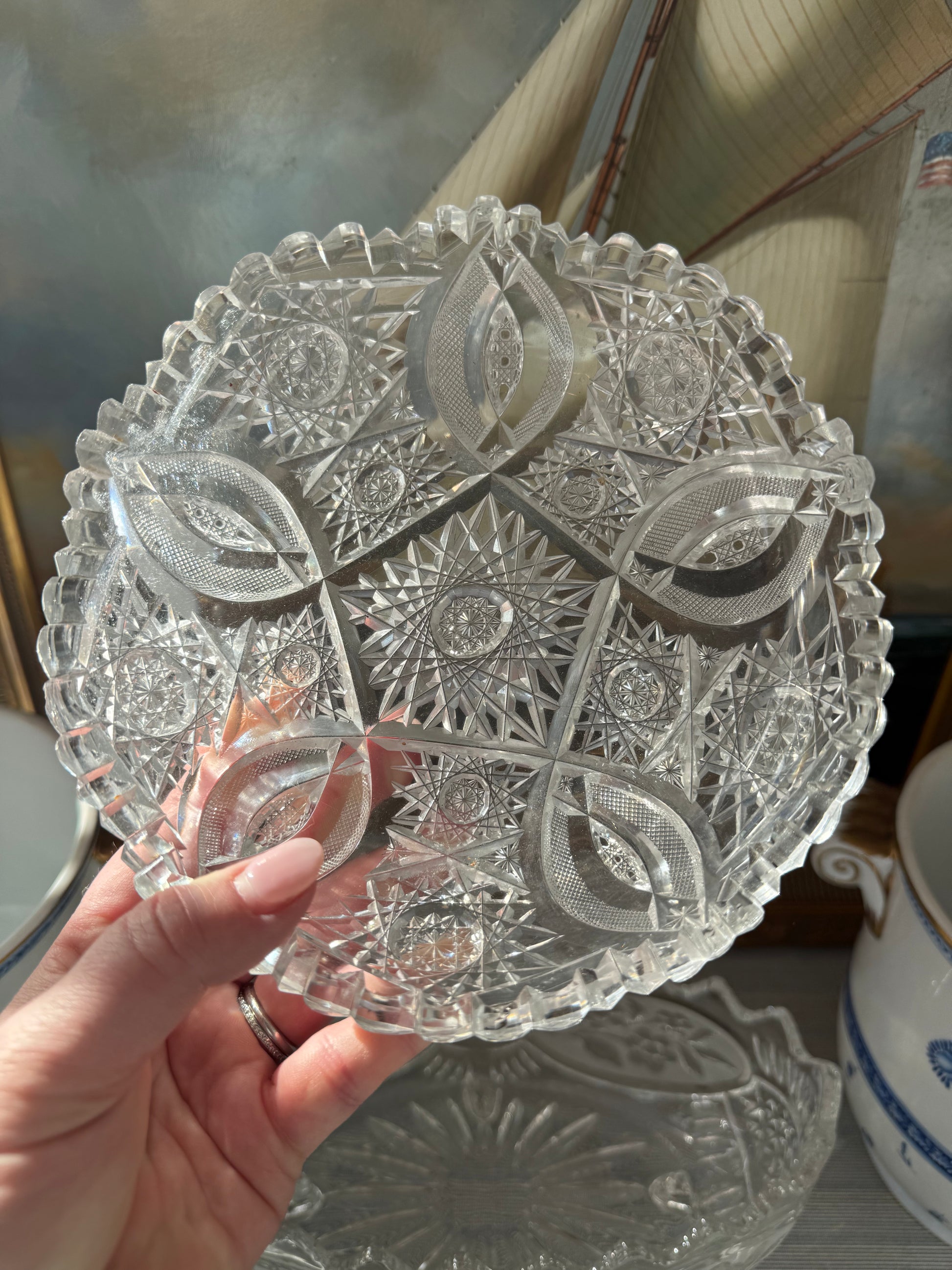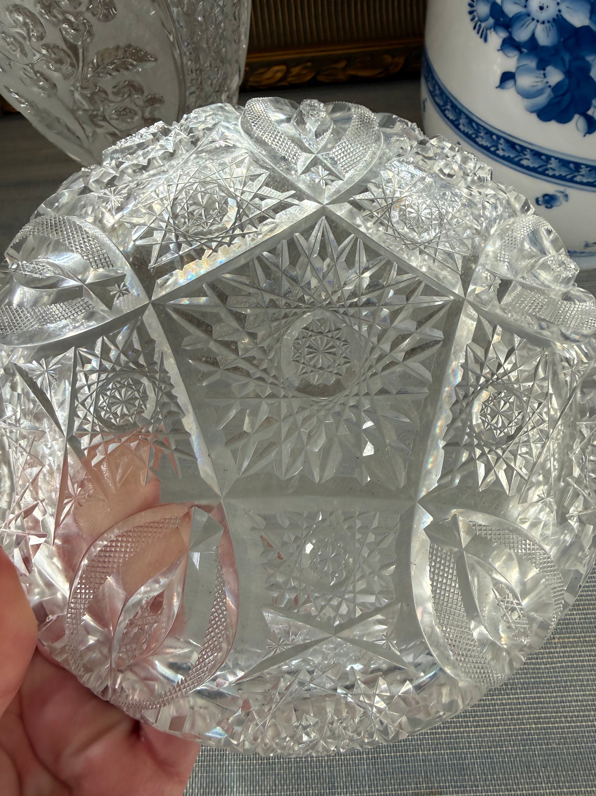 Excellent condition, no chips or cracks. Beautiful frosted etched floral detail and sawtooth edge cuts at the top, perfect for holding tulips or other stems in place! Measures 10” tall by 5” wide.