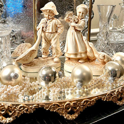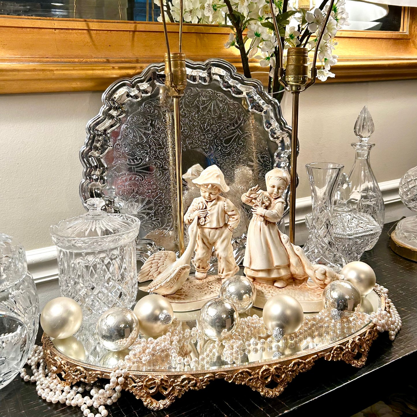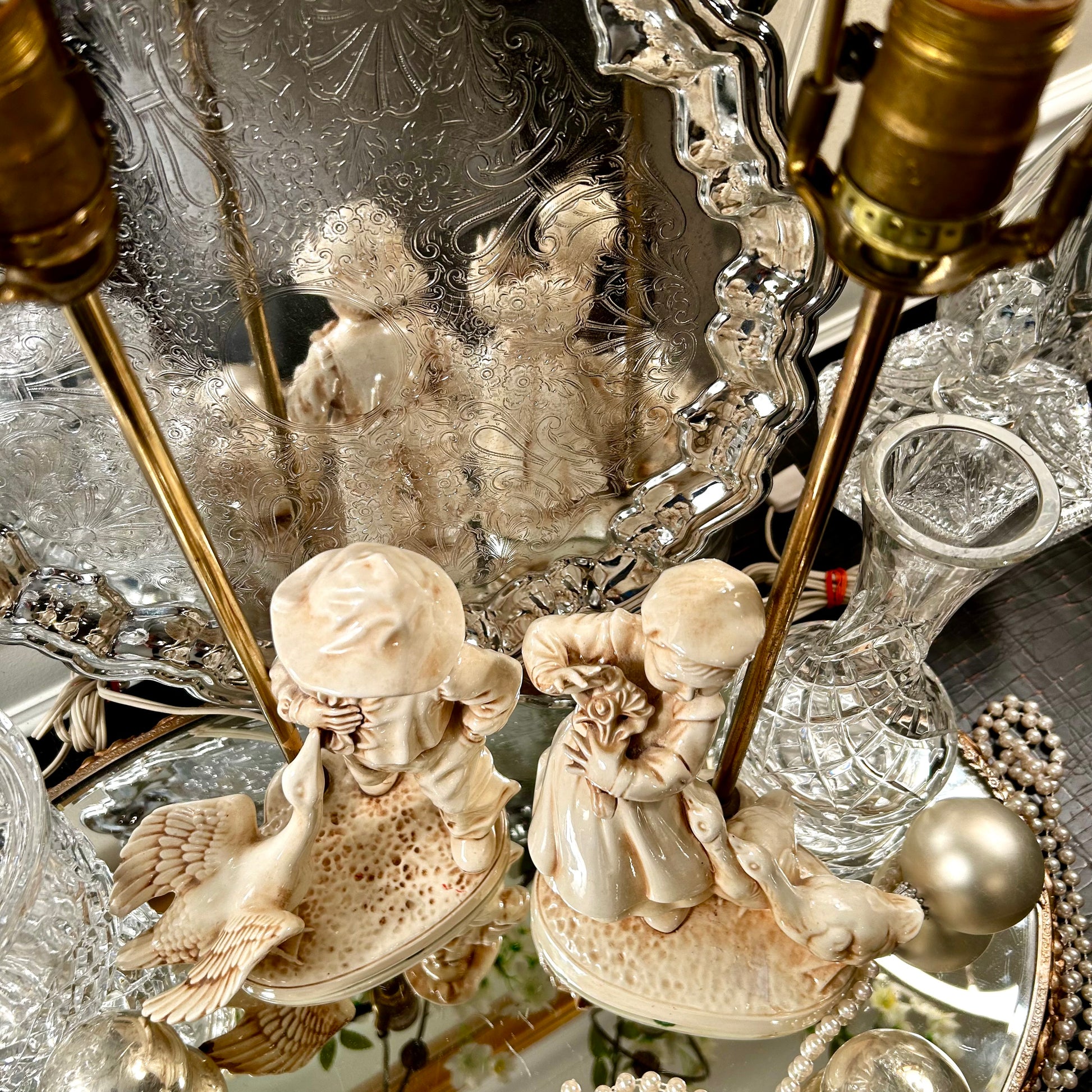 Whimsical pair of porcelain statue lamps girl & boy with their loving ducks