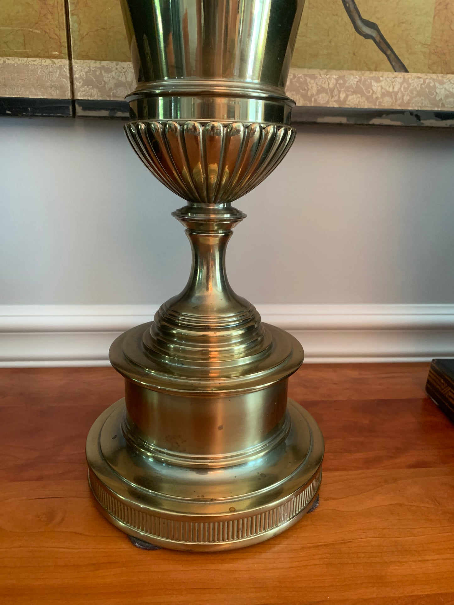This remarkable Vintage Brass Stiffel Trophy Lamp (no shade) is 31.5” tall and a generous 21” in diameter at the base. It's in perfect working condition, wired for a 3-way bulb, and proudly displays the Stiffel Sticker for authenticity. This is a great, Classic lamp that will stand the test of time and blends seamlessly with many decor styles.