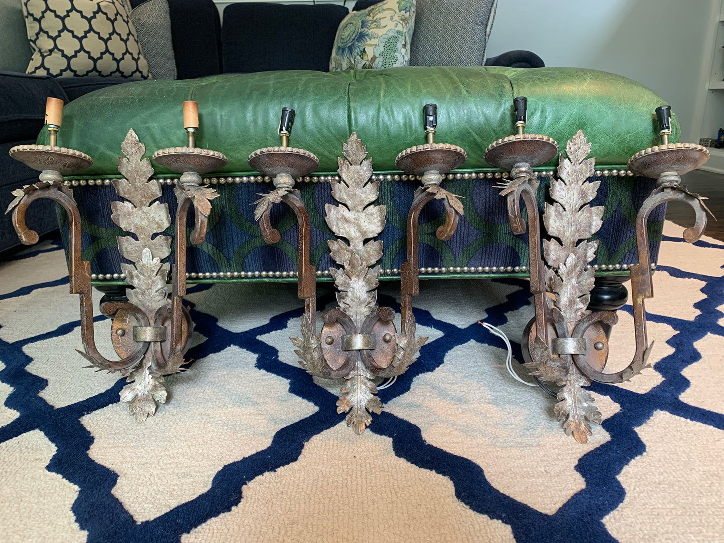 Transform your space into something extraordinary with this gorgeous set of 3, 19-inch Acanthus Leaf hard wired Double Wall Sconces. At 11.5-inches at its widest, and 7-inches deep, these sconces will inspire a dreamy atmosphere with their beautiful designs! There is damage to one of the composite holders, not visible when installed (see photo)