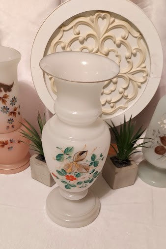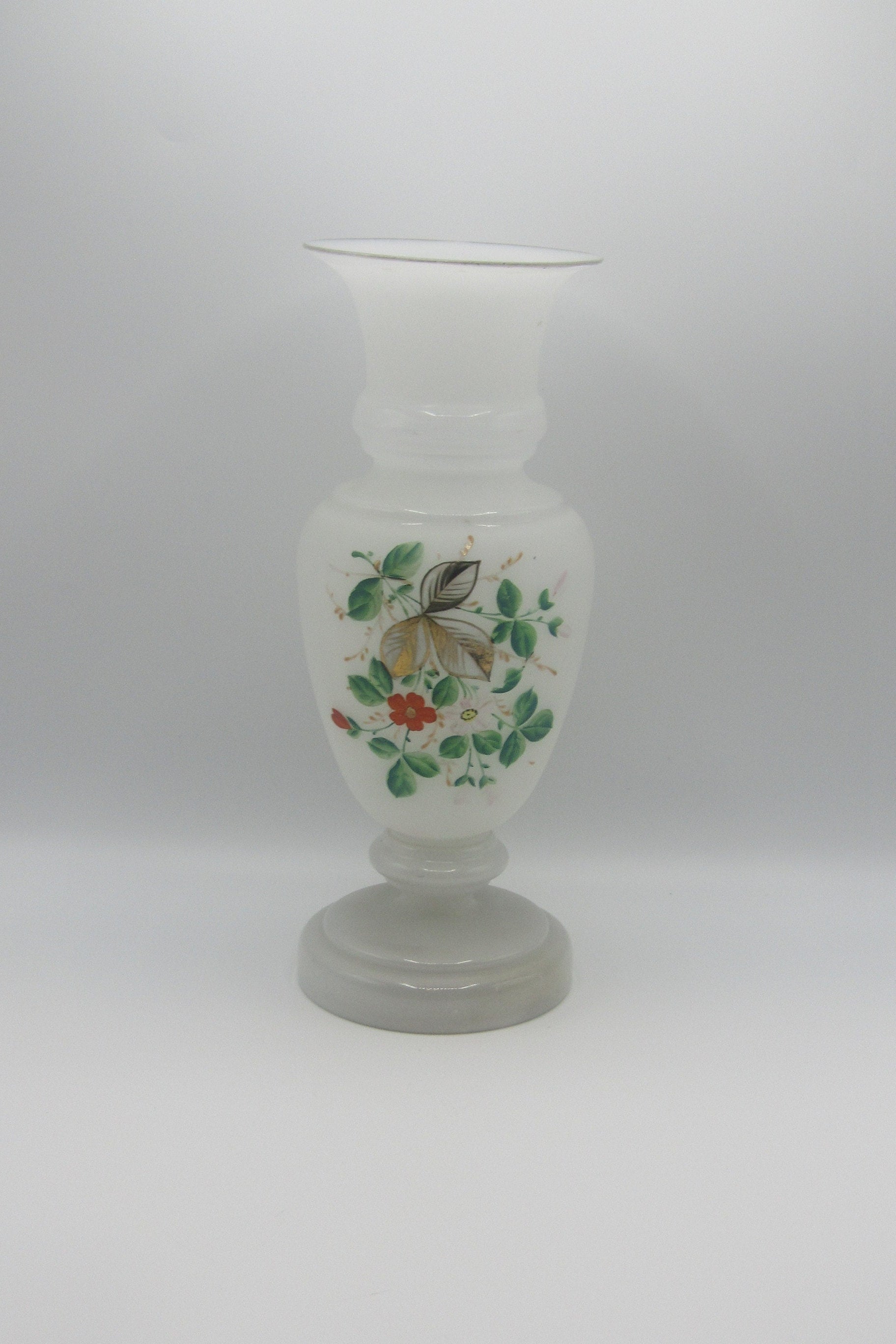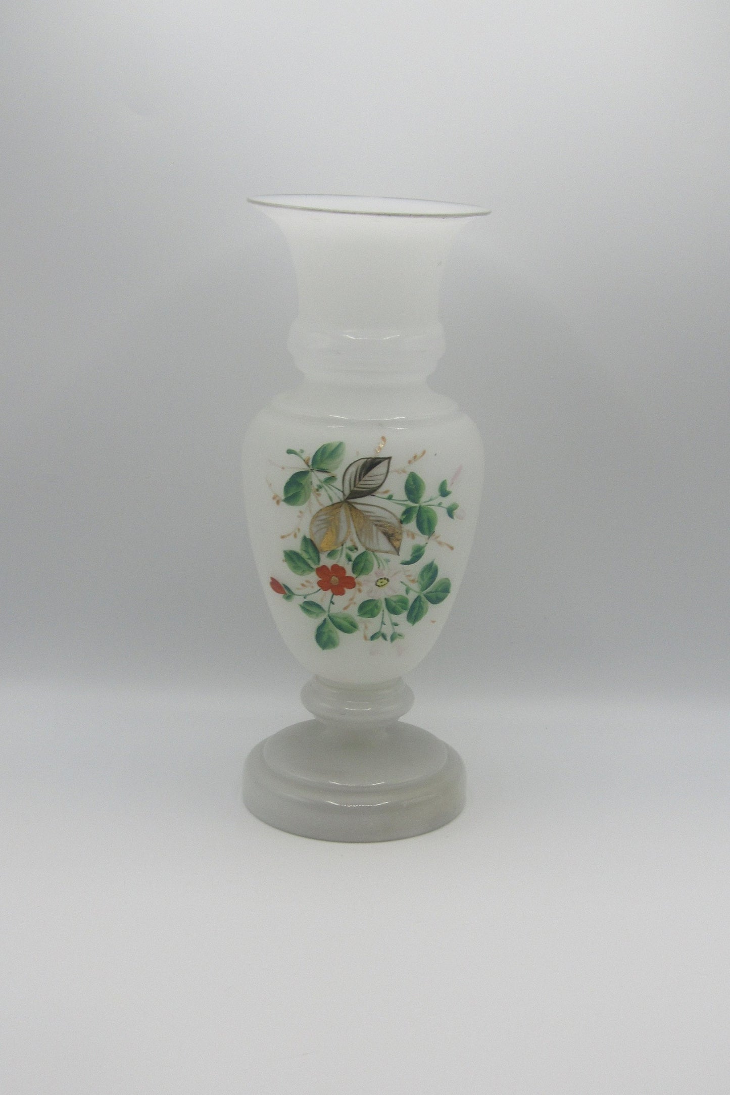 This elegant Large Bristol Hand Blown and Hand Painted Vase adds a timeless beauty to any living space. Expertly crafted from original Bristol white glass, this 12 inch tall vase is finished with a delicate, hand-painted floral motif. The pontil marking reveals the artistry of the hand blown glass process, making this a truly one-of-a-kind decor item! Rendering any room with a special ambience, this beautiful vase is in excellent condition.