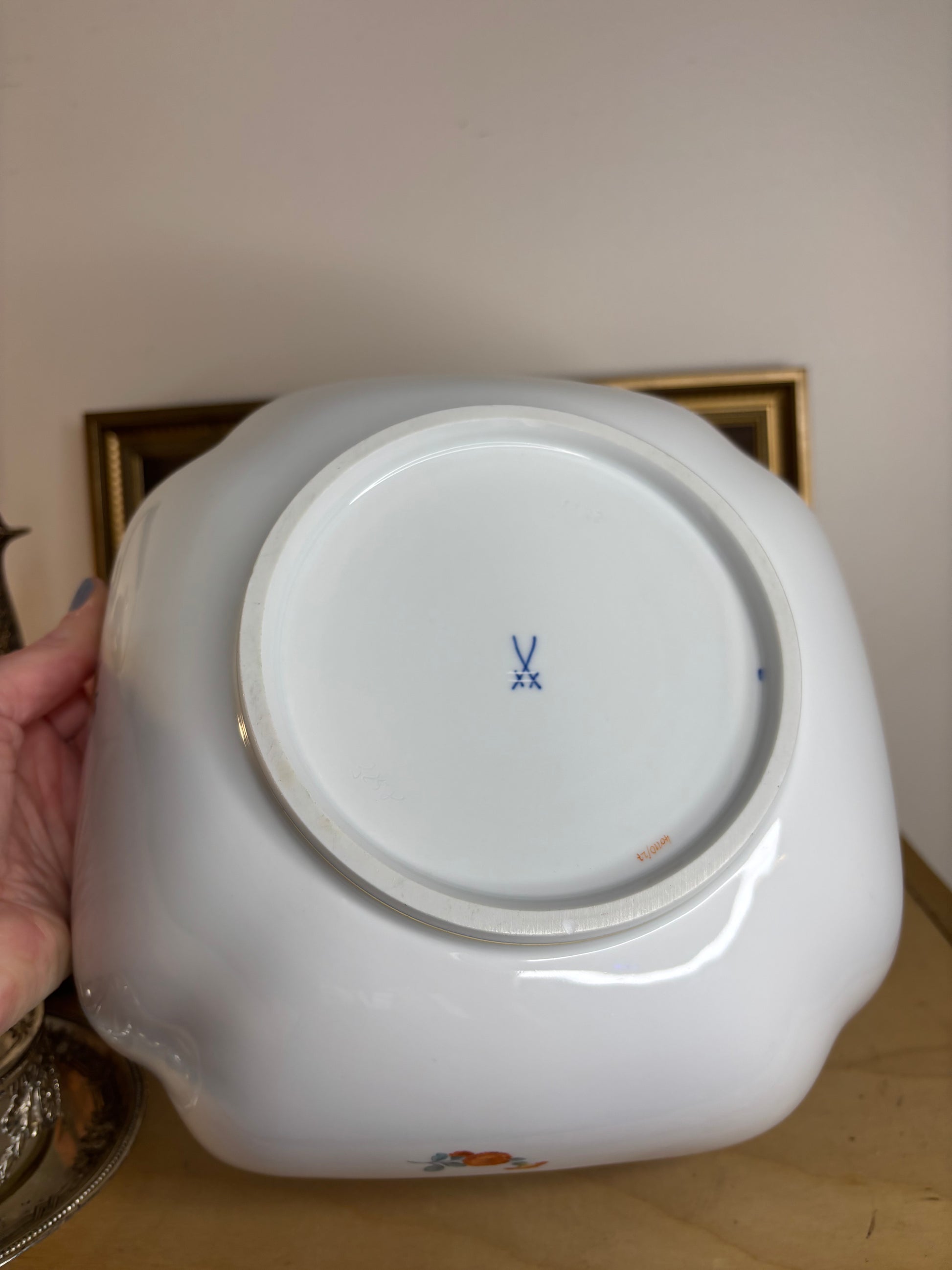 Lovely Meissen floral bowl with gold rim and embossed designs! Measures 9” x 9” x 3.5”. Has a few small chips at base. Displays beautifully! As is!