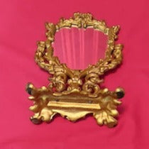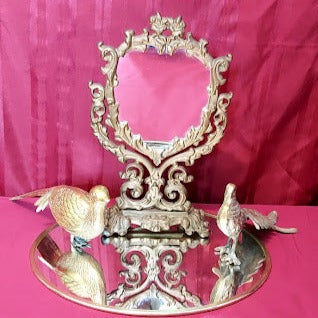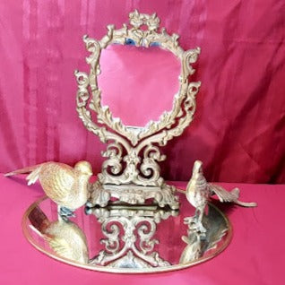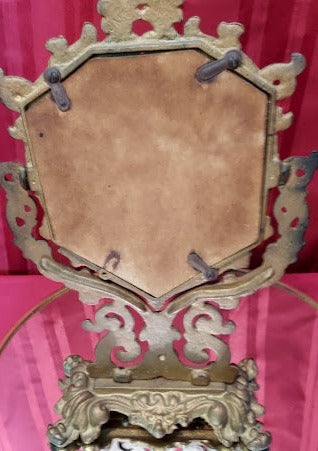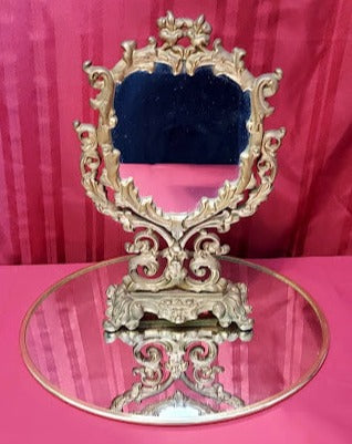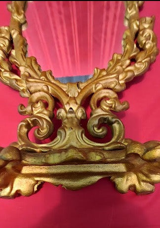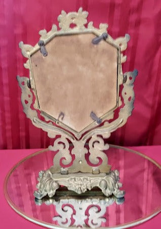 Our exclusive antique cast iron vanity/dresser mirror by Iron Art is a timeless Victorian work of art, featuring an ornate floral design and a striking gold color paint. The 8"W x 12"H mirror is in pristine condition, and is by Iron Art, marked JM5. Adorn your dressing table with this exquisite piece, sure to dazzle guests and provide an air of elegant sophistication to any room.