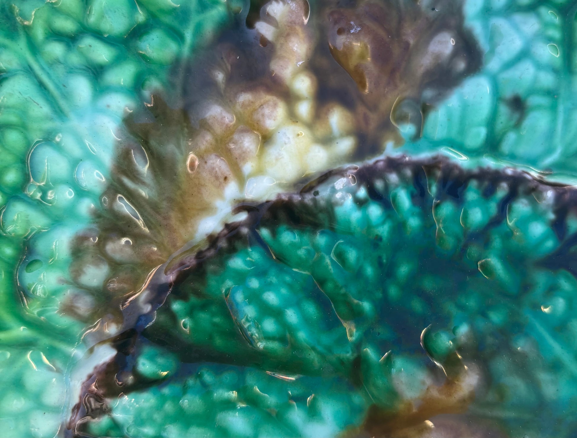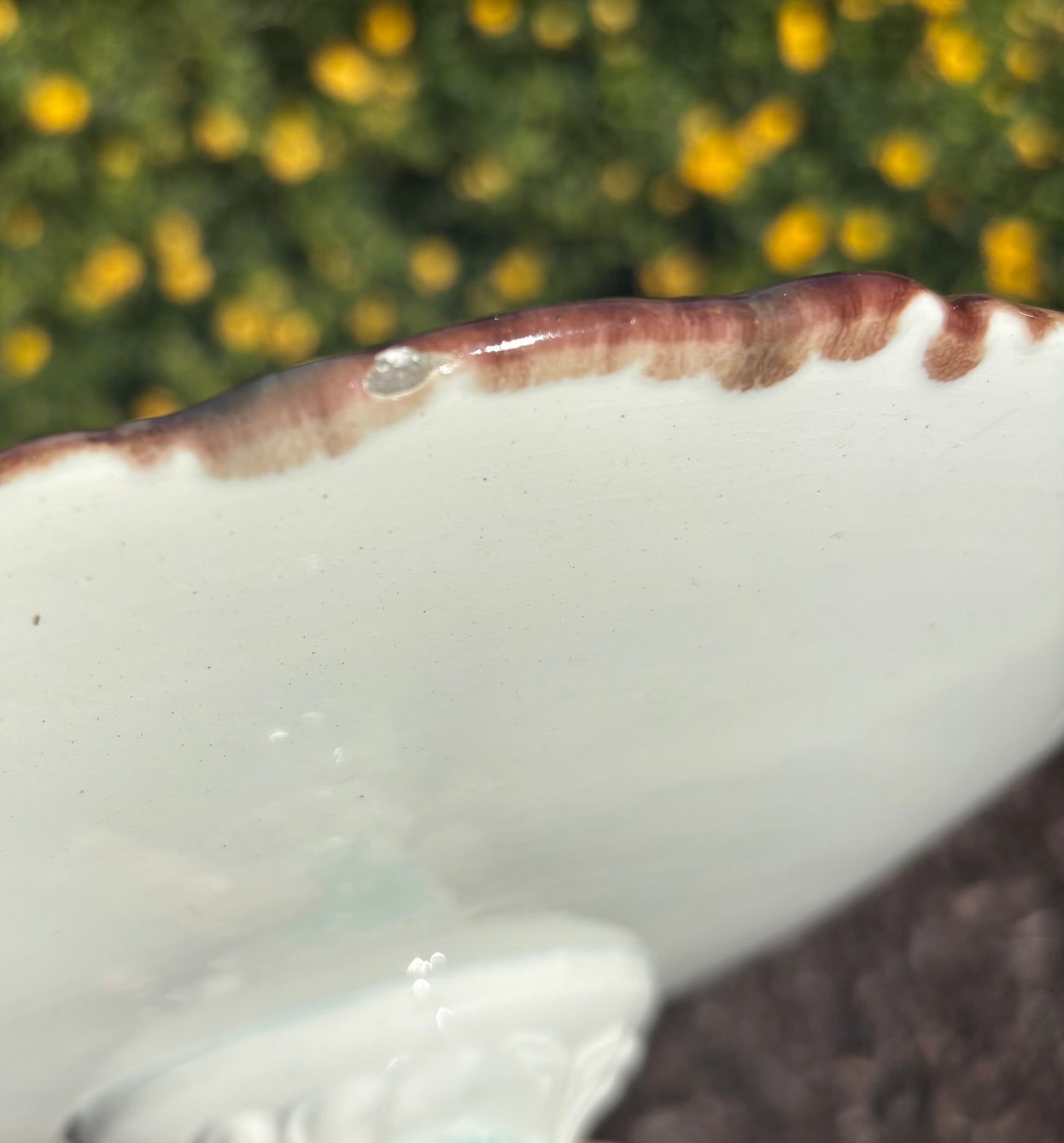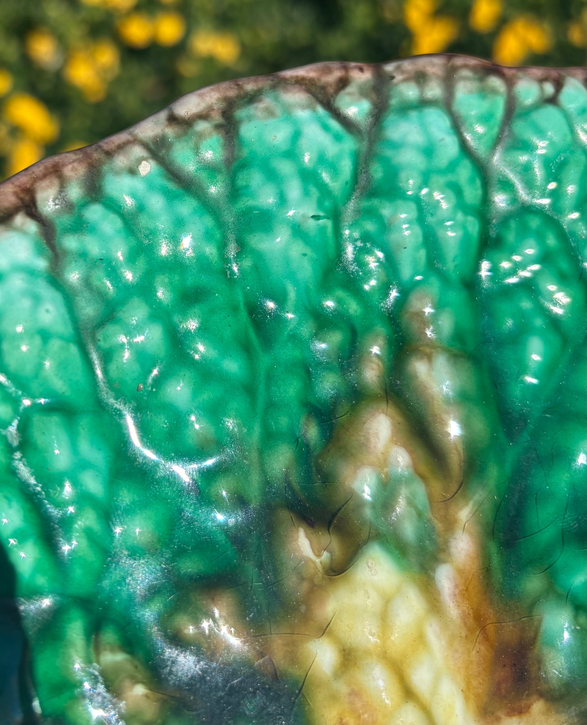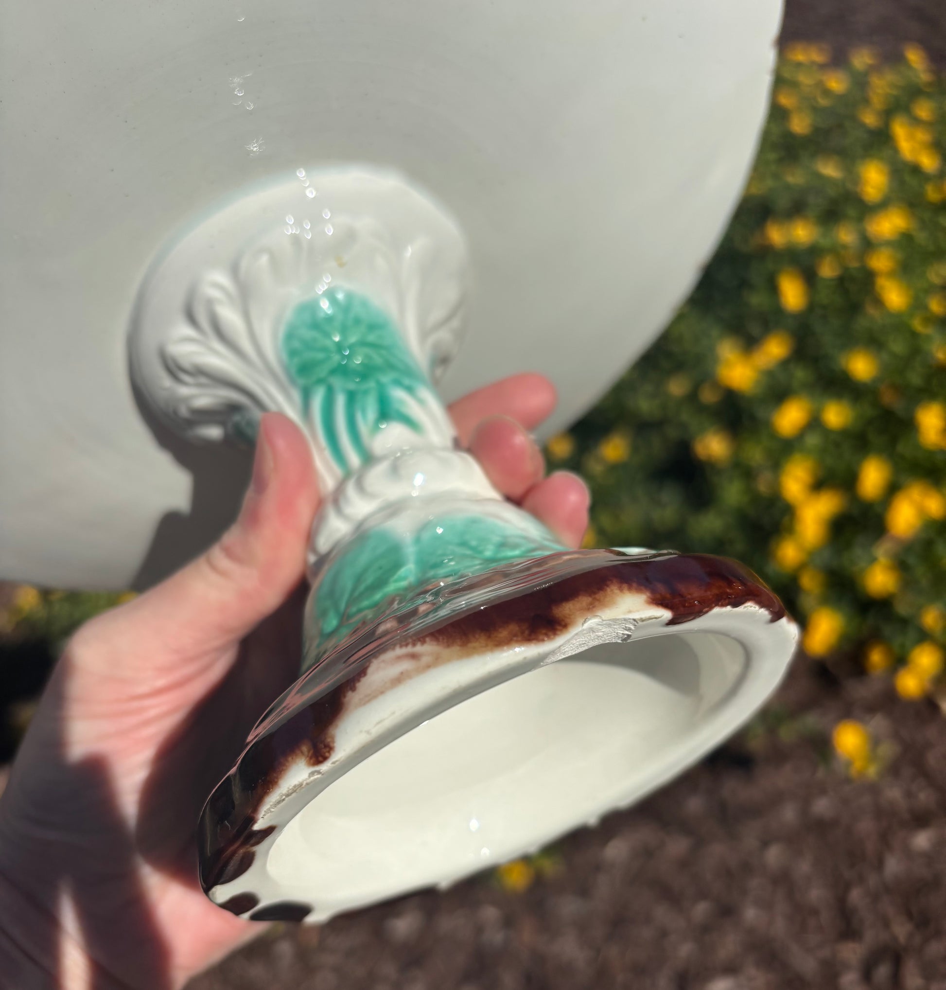 Stunning Majolica Begonia Leaf pedestal cake stand! As is! Measures 10 1/4” x 5.5”.