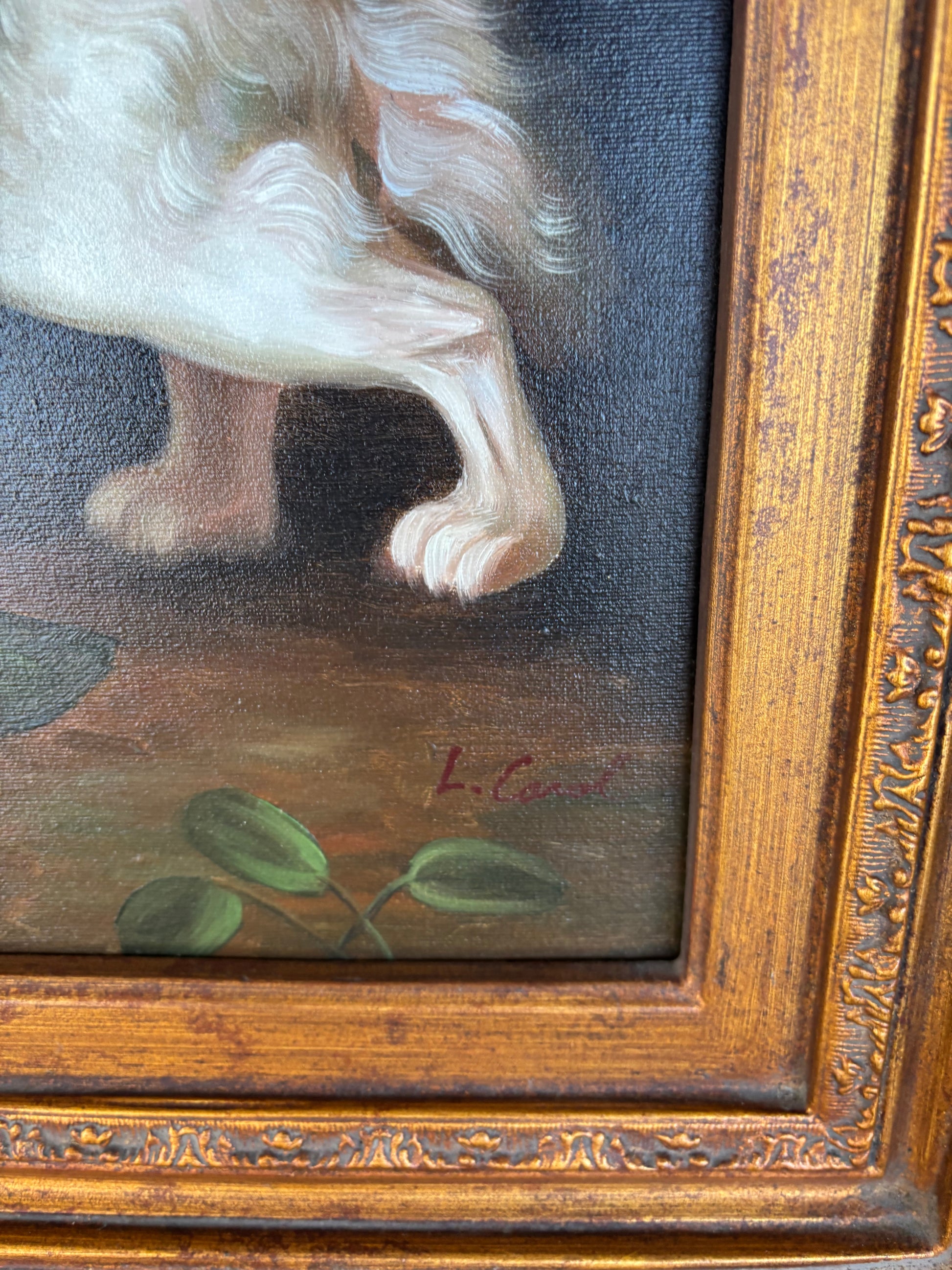 Beautiful signed painting of dog chasing a butterfly in ornate frame!