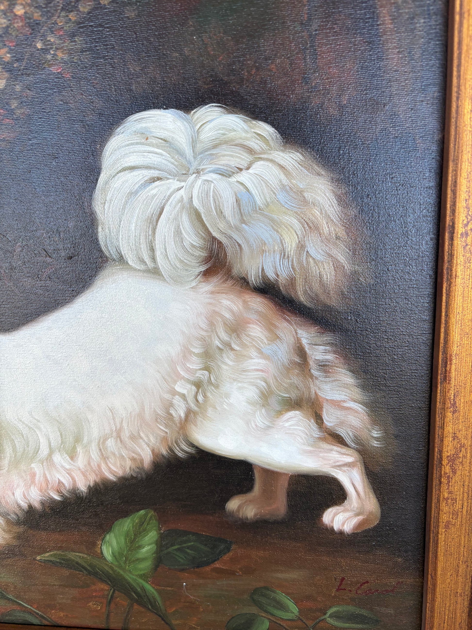 Beautiful signed painting of dog chasing a butterfly in ornate frame! Artist inspired to replicate from the original painting. Measures 33” x 29”. In excellent condition! Ready to be hung!