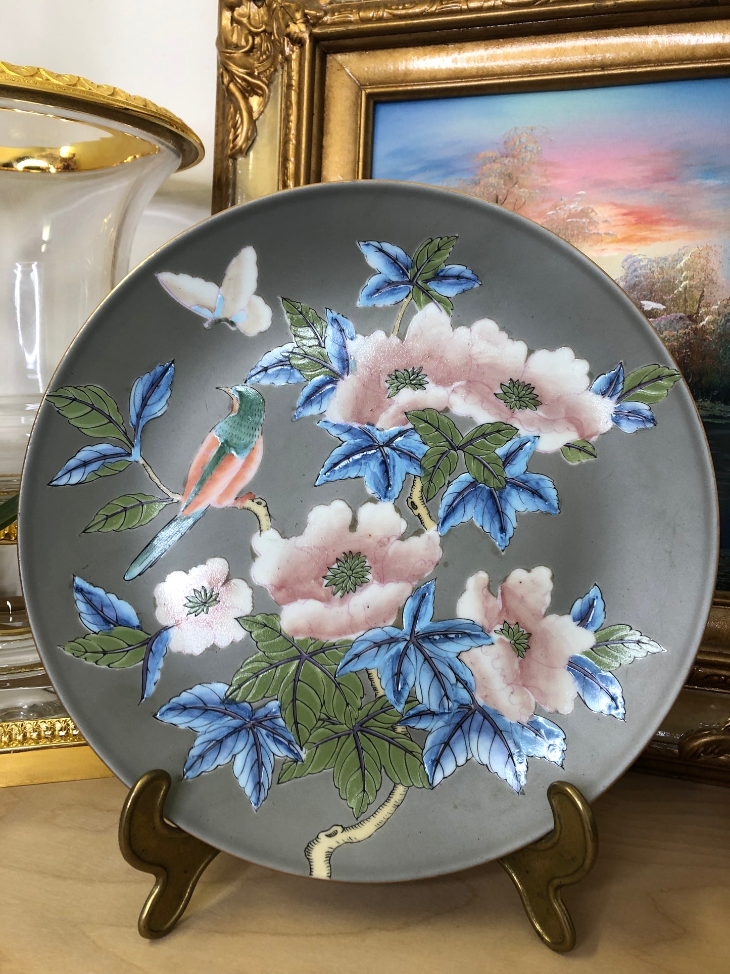 Beautiful chinoiserie plate showcasing a lovely bird and pops of pink and blue floral details! Measures 10 1/4” in diameter. Excellent condition!