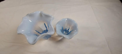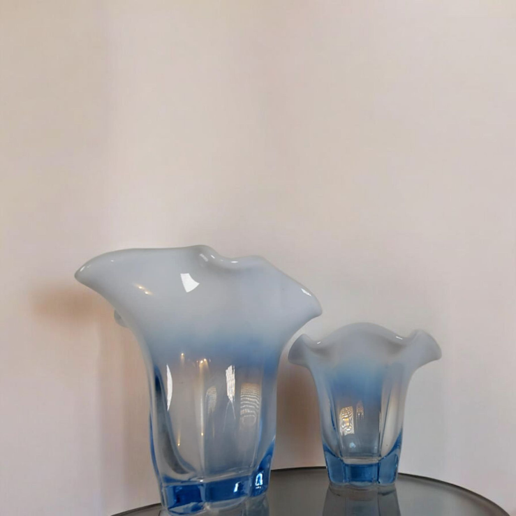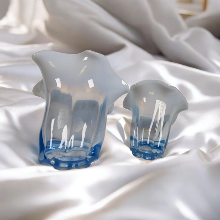 Elevate your home decor with this vintage set of Duncan Miller Blue Opalescent Canterbury vases! Perfect as candle holders or standalone pieces, these exquisite vases feature a ruffled rim and are in excellent condition. Add a touch of elegance to any room with this matching set.
