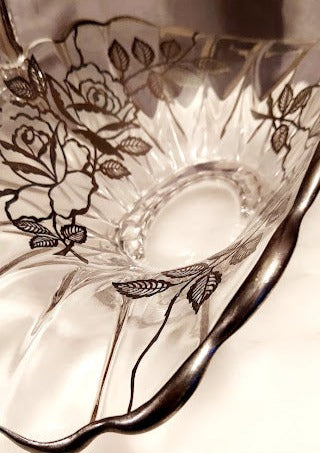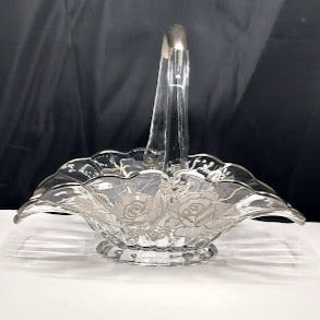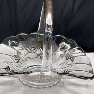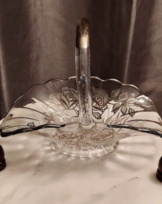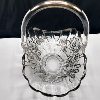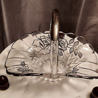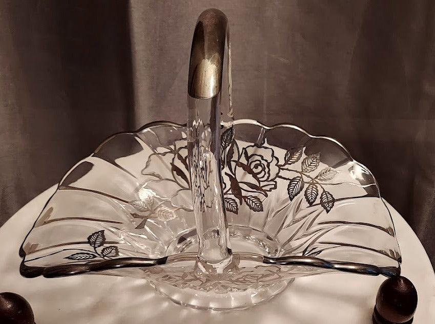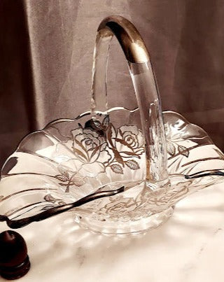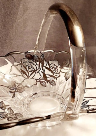 Vintage glass bridal basket with silver overlay, beautiful Rose design
