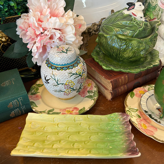 Whimsical vintage bow basketweave floral large lidded jar centerpiece.