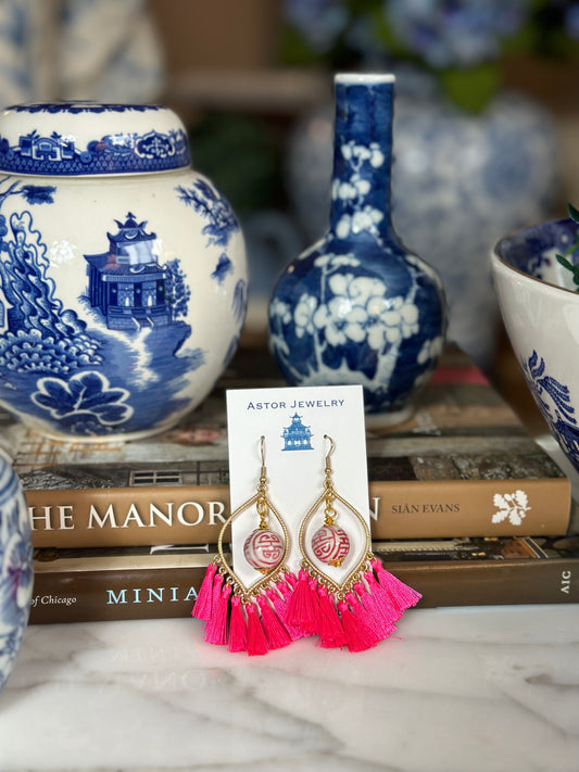 Danny's Fine Porcelain - Chinoiserie Pink Tassel Dangle Earrings - Made in U.S.A