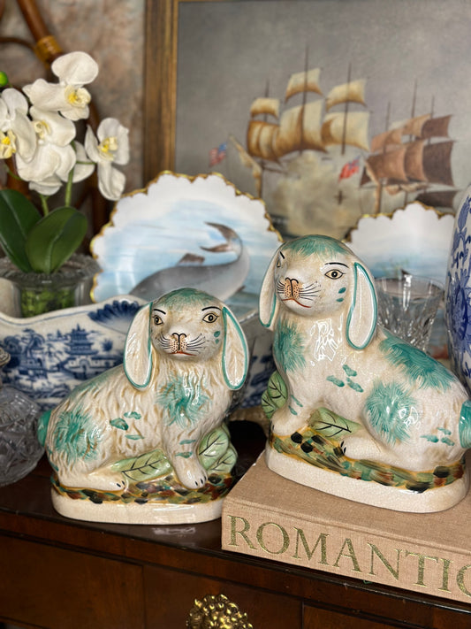 Danny's Fine Porcelain: Ceramic Bunny/Rabbit Figure Pair, Green & White, 8x4x7" - Pristine!