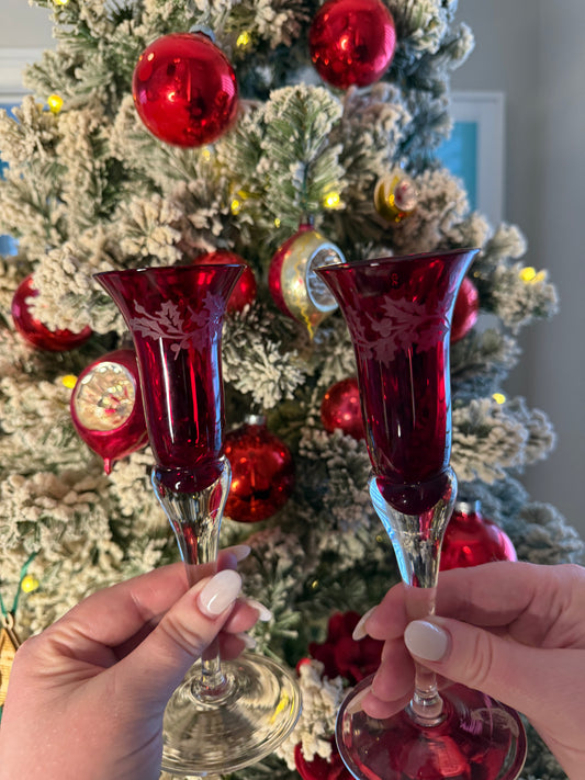 Vintage Lenox Holiday Gems Pair of Ruby Etched Glass Candlestick Holders