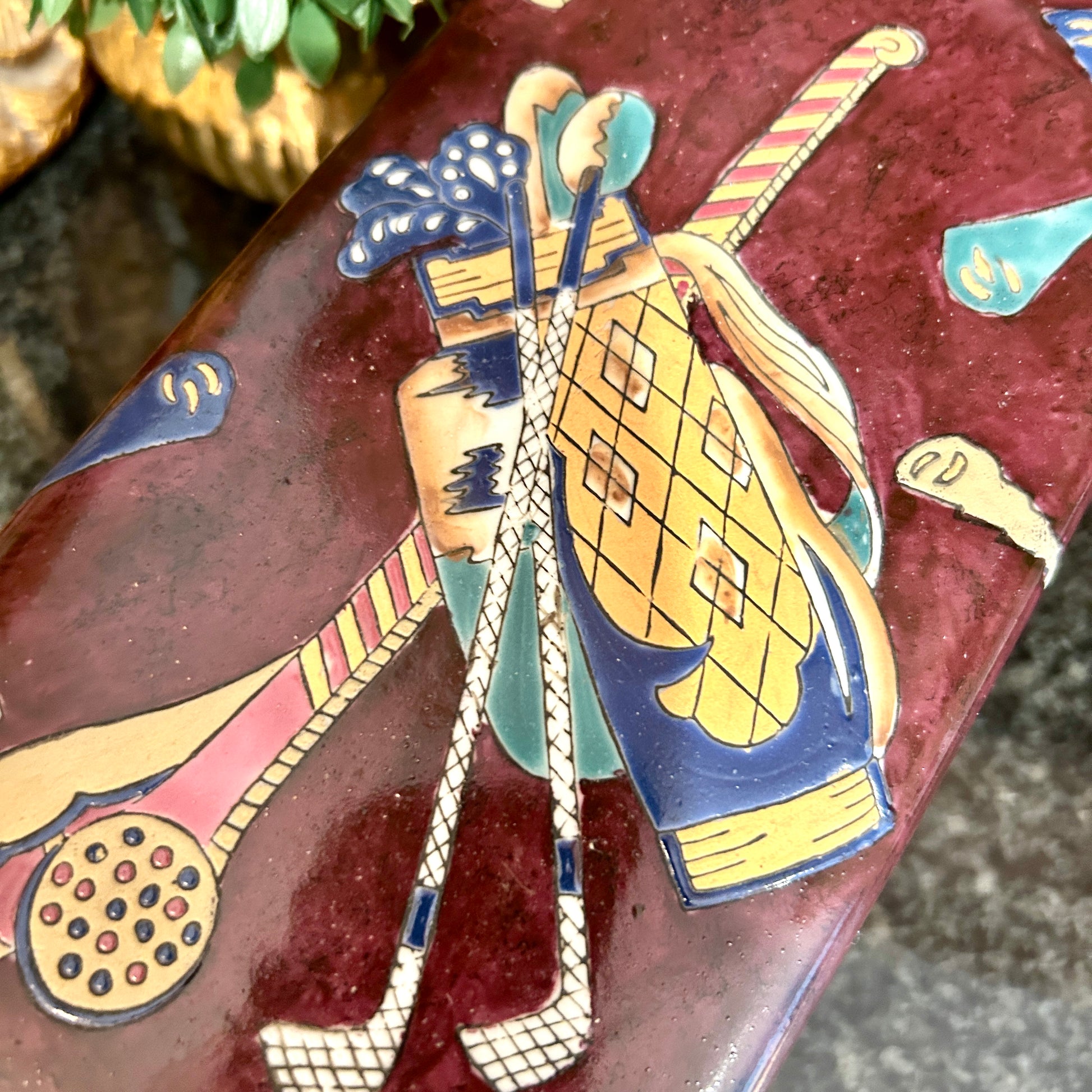 .Gorgeous large golf ceramic lidded box.  The box is free of any chips, measuring 8.5 x 4.5 x 4 a truly impressive piece.