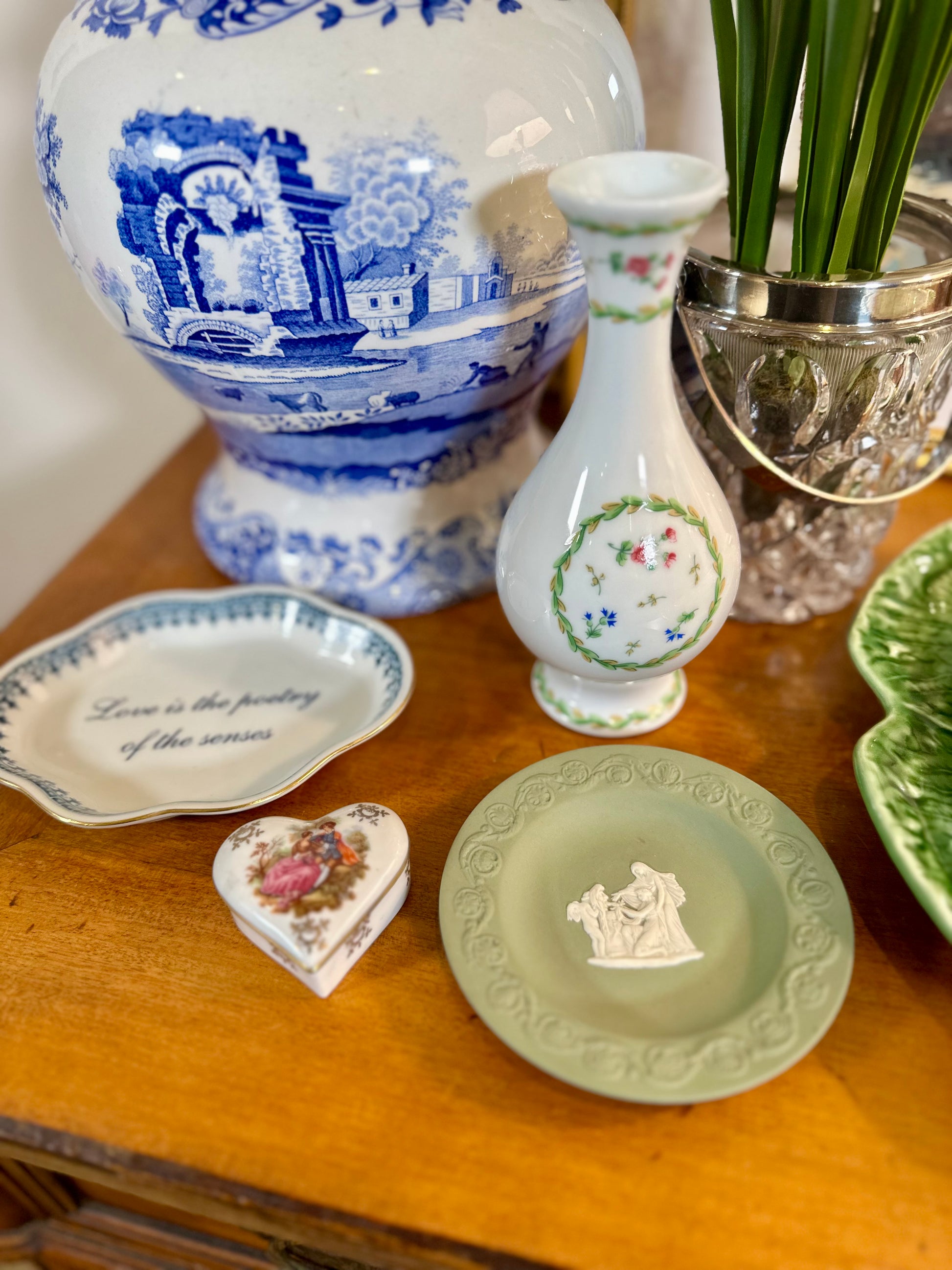 A delicate finishing touch for an intimate table, this vintage Bernardaud Limoges porcelain bud vase in the Poe pattern brings soft romance and timeless French elegance to your Valentine’s Day setting. Hand-painted floral sprays in blush pink, cornflower blue, and fresh green are framed by laurel wreath garlands, creating a look that feels classic yet light and effortless. Perfectly scaled for a single bloom or a few clipped stems, this vase is ideal for smaller, layered tablescapes—designed to complement celadon-inspired plates, polished silver, and candlelight without overwhelming the place setting. Very good vintage condition with no chips or cracks. Light wear to the base consistent with age.