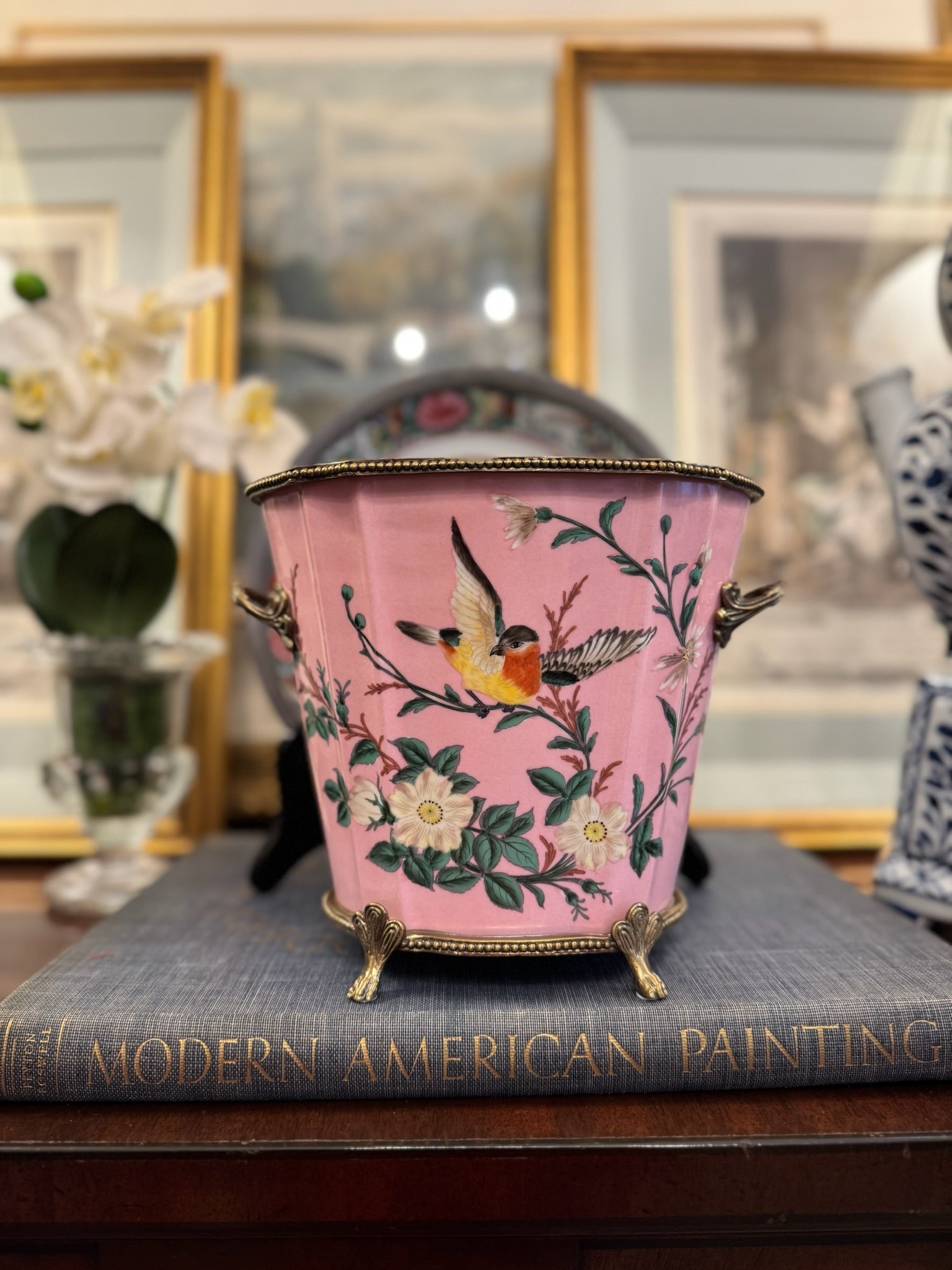 Pink Botanic Footed Basin/ Planter: Birds, Hand Painted, 9x6x7” Add a touch of nature to your home with our Pink Botanic Footed Basin/Planter featuring hand-painted birds. This versatile 9x6x7" piece adds charm to any space and is perfect for displaying your favorite plants. Bring beauty and functionality together with this unique and eye-catching piece!