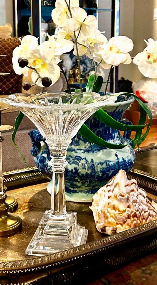 Vintage 10” Etched Floral Lead Crystal Footed Vase