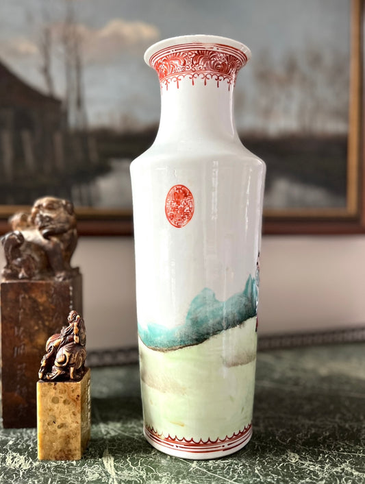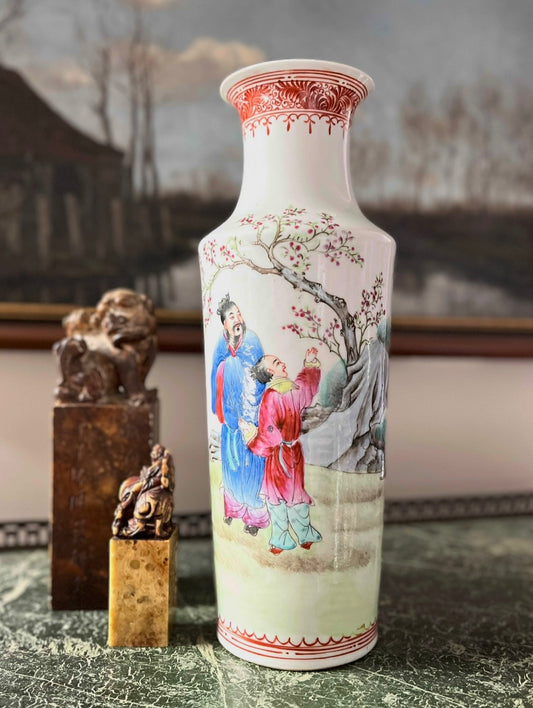 Beautiful Tall Chinoiserie Cylindrical Peach Vase With Lucky Bats (made exclusively for Garfinkel’s)