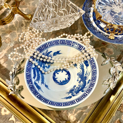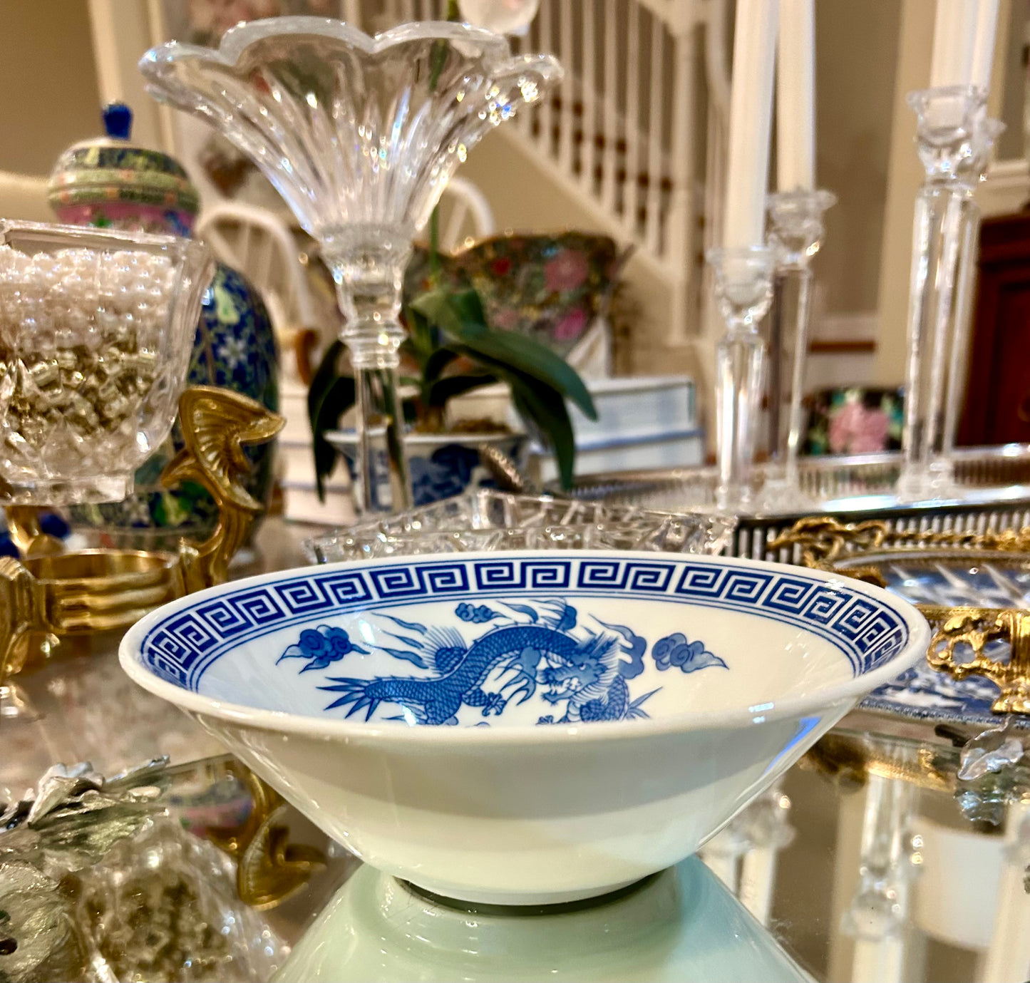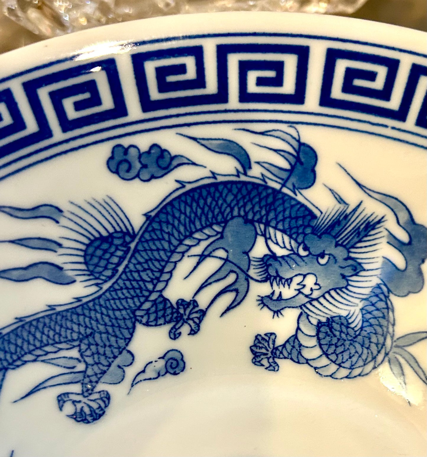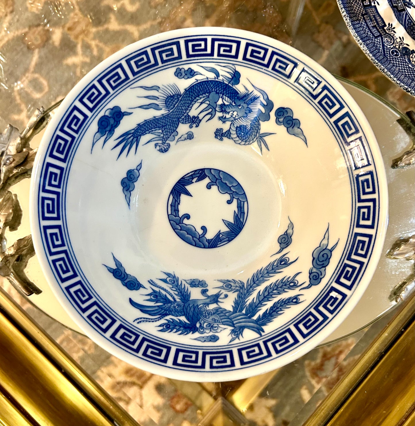 Bold blue and white chinoiserie dragon bowl with Greek key trim