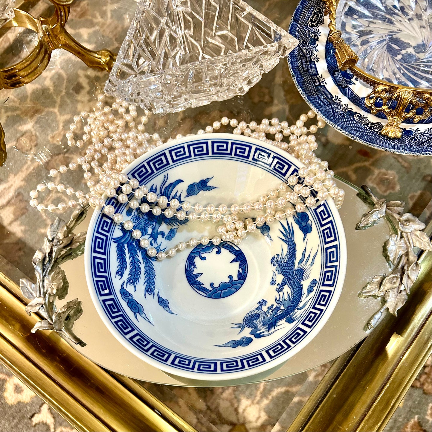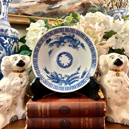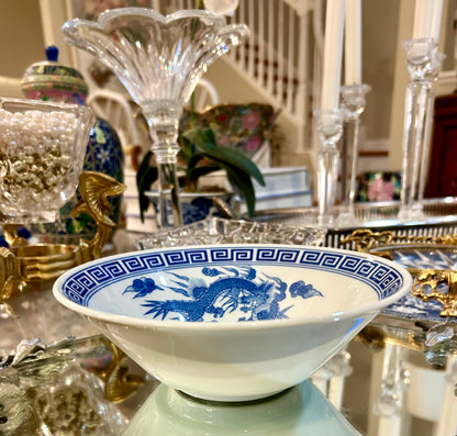 This stunning chinoiserie dragon bowl features a bold blue and white design, complemented by a classic Greek key trim. It has been expertly stamped and is in impeccable condition, with no chips or cracks. With an 8 inch diameter, it is the perfect size for any display or use in your home.