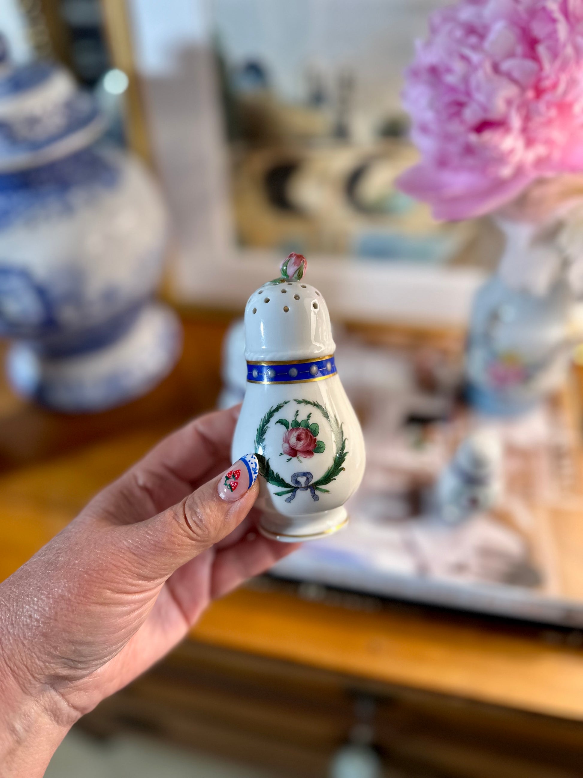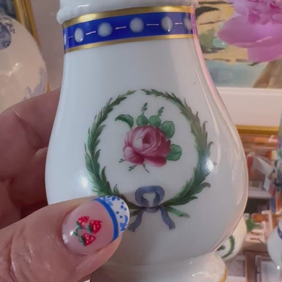 This is the prettiest set of three vintage hand painted porcelain muffineers or sugar shakers in the Princess Blue pattern by Richard Ginori made in Italy and dating to the late 20th century. These three shakers come in graduating sizes with beautiful hand painted details on a white porcelain background with cobalt blue bands with raised white beads and gold gilding, green laurel wreaths with pale blue bows and pink roses in the center of the wreaths. Two of the shakers are topped with sweet figural pink rosebuds and all have a ribbed rope edge just above the blue bands. These are exquisite as all Ginori porcelain pieces are made of the finest quality porcelain with the highest attention to details. They would be a beautiful addition to a tea party or brunch and would also make a lovely hostess gift. Use one for powdered sugar, one for cinnamon sugar and one for infused sugar such as vanilla, lavender, etc. These are in excellent vintage condition with one minor disclaimer to the smallest shaker having some slight wear to a couple of the white beads in the blue border and gold gilt. Otherwise these are almost pristine. This is a very hard to find pattern outside of Italy and it was discontinued in the 1990's. All are marked with the Richard Ginori mark and made in Italy.