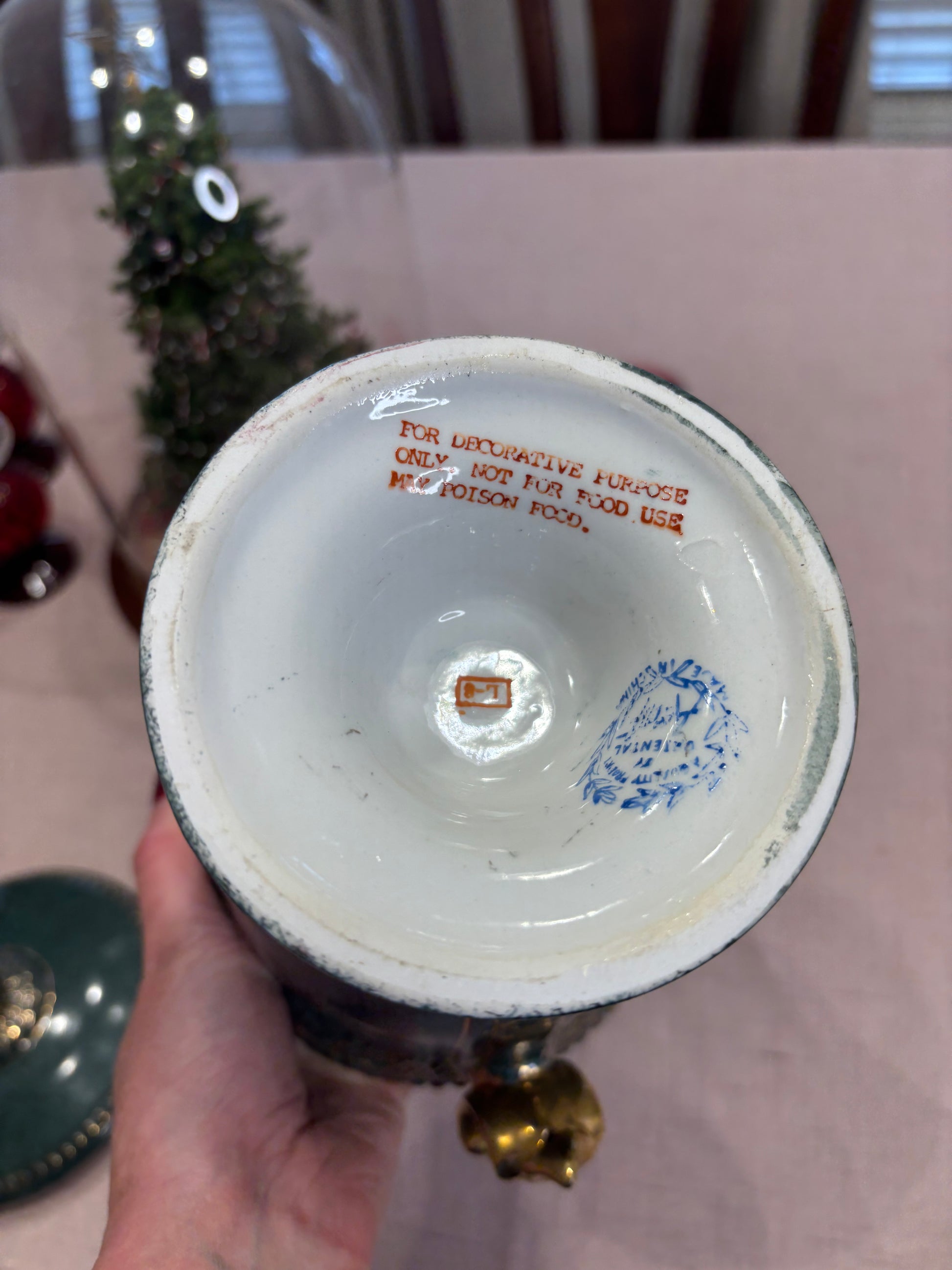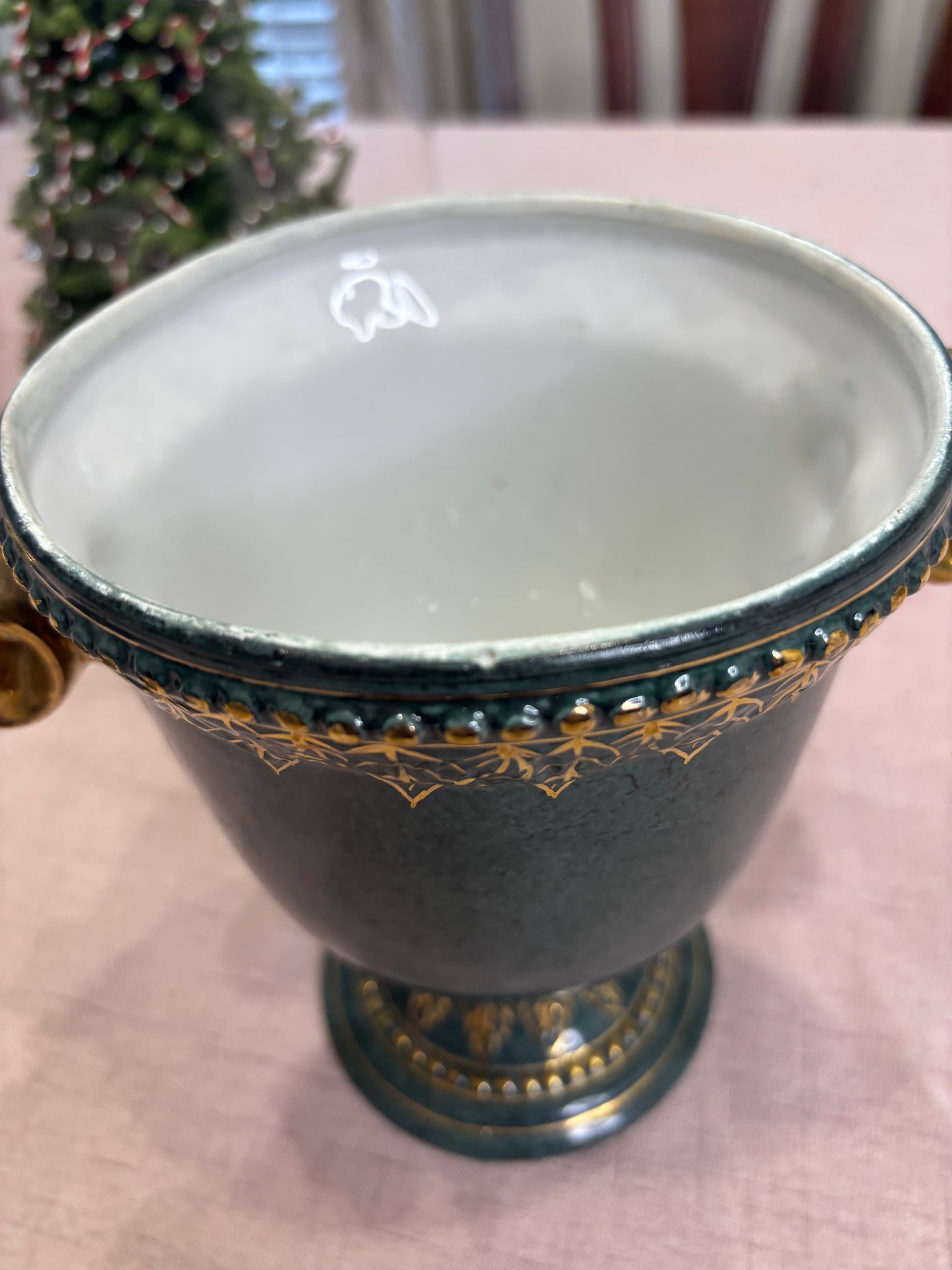 Decorative Green and Gold lidded jar! Features gold accents and handles! Measures 9.5” tall. Has one tiny chip on rim, not seen with lid on.