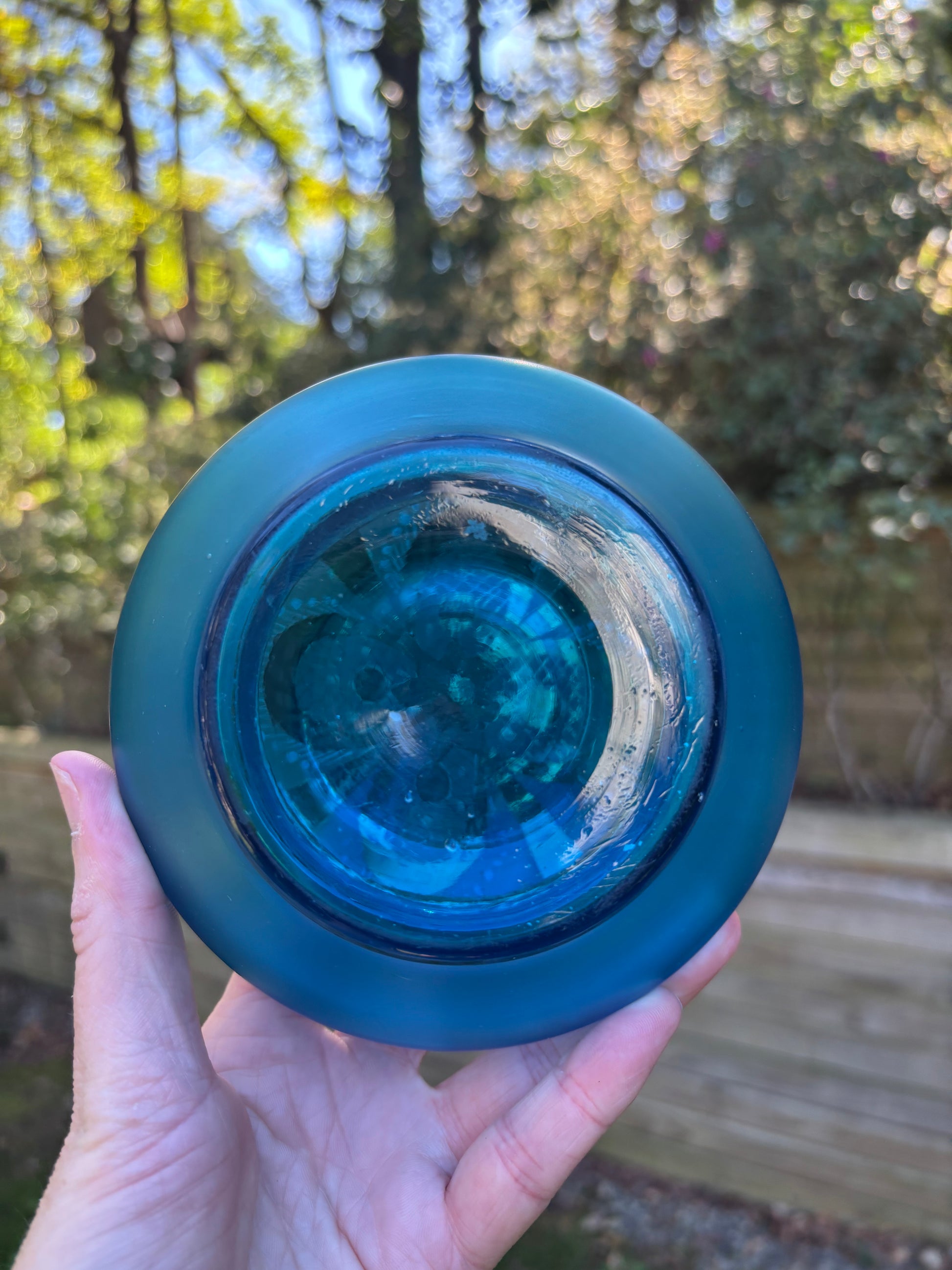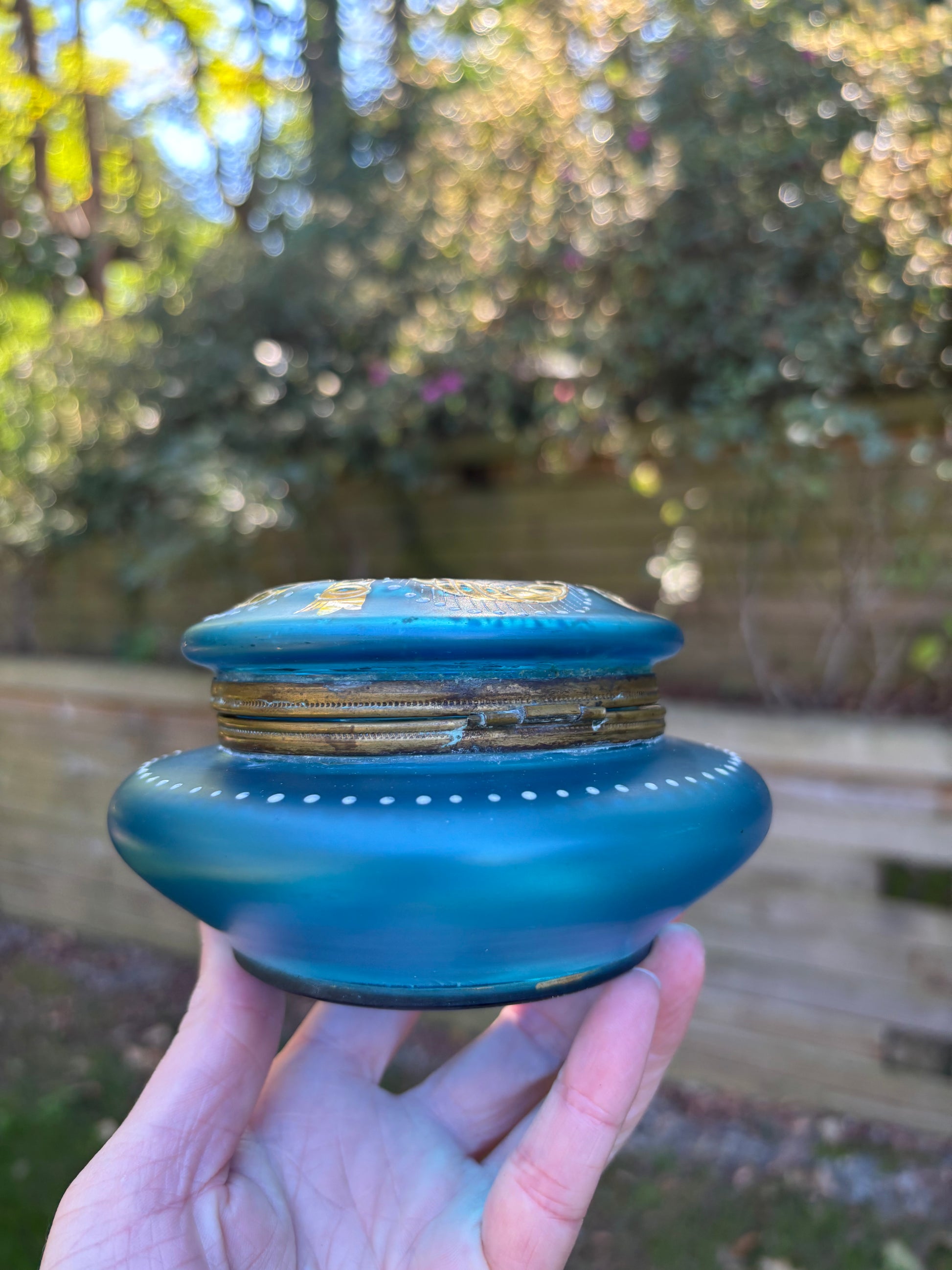 Gorgeous older blue and gold dresser box with handpainted details! Stunning design, bronze clasp, and a gorgeous blue! Measures 5” x 3”.