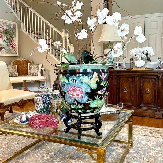 Rare and spectacular massive planter in noir famille botanical design, 20.5" Tall - Pristine!