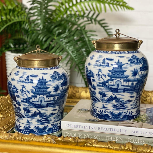 Danny's Fine Porcelain - 13” Tall Blue/White Porcelain Pagoda Jar W/ Bronze Lid