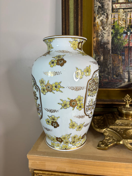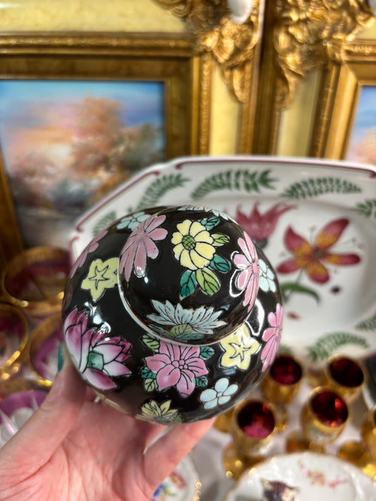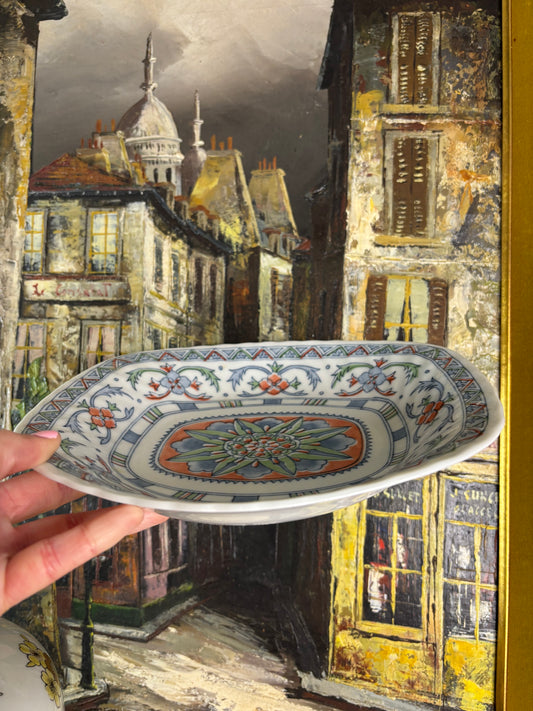 Chinoiserie 10” floral bowl with red, white, blue, and gold hues!