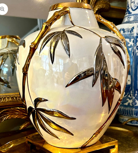 Extremely chic Italian designer Alessi vintage metallic faux bamboo gold and silver detailing on opal irredecent white vase