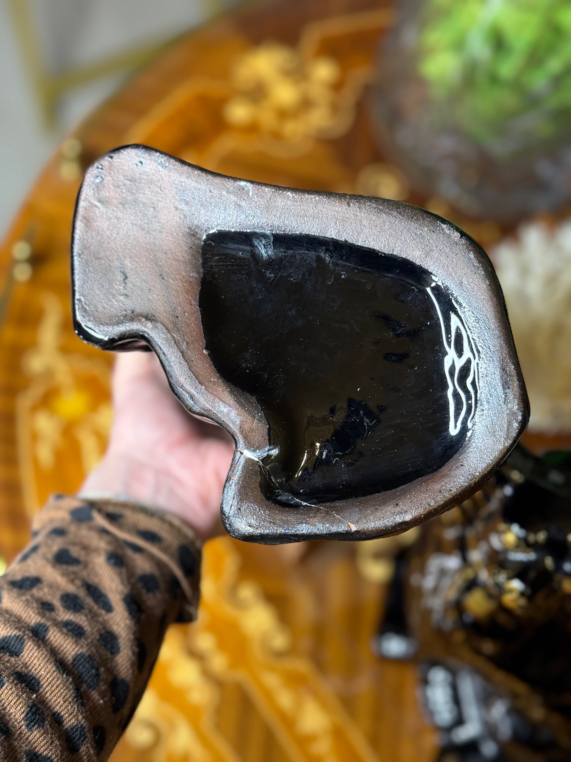 Antique 10” Tall English Black Staffordshire Mantle Dogs (c. 1890–1910) – Pair with Gilt Chain
