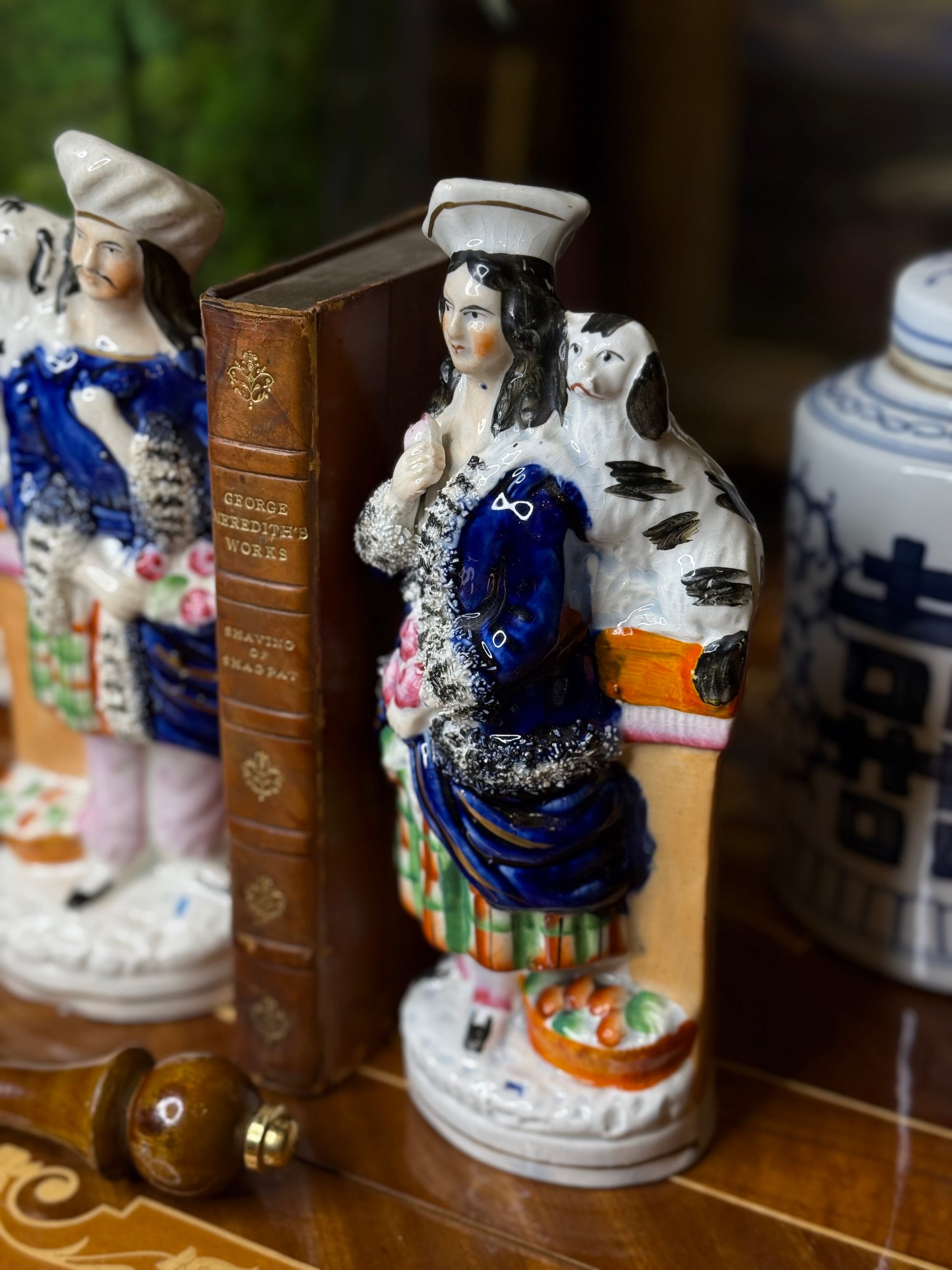 A charming Victorian Staffordshire couple, modeled as a pair and standing a full 9 inches tall, each accompanied by a loyal black-and-white spaniel at their side. Dating to the mid-to-late 19th century, these figures capture the whimsical storytelling that made Staffordshire pottery beloved throughout Victorian homes.