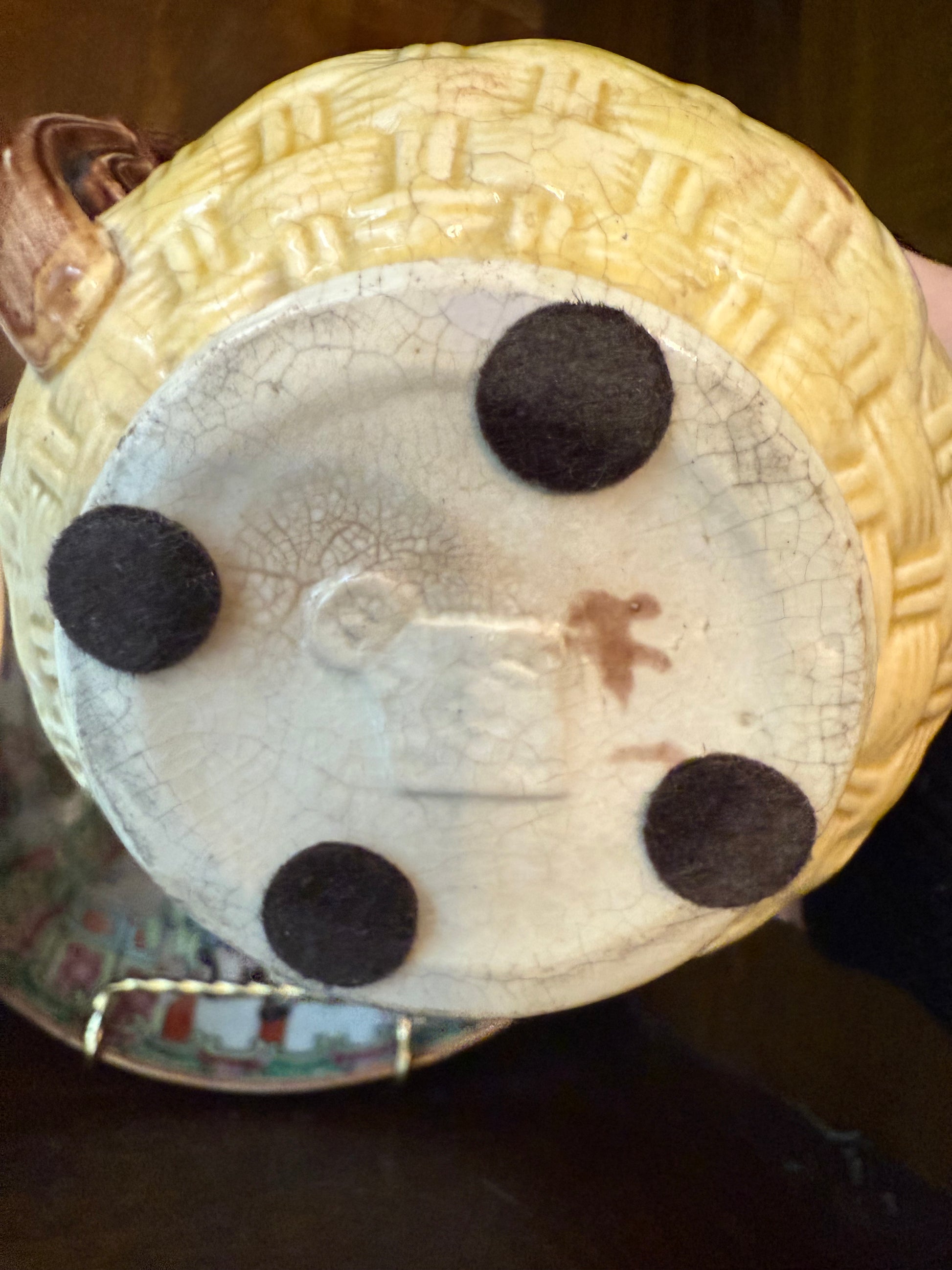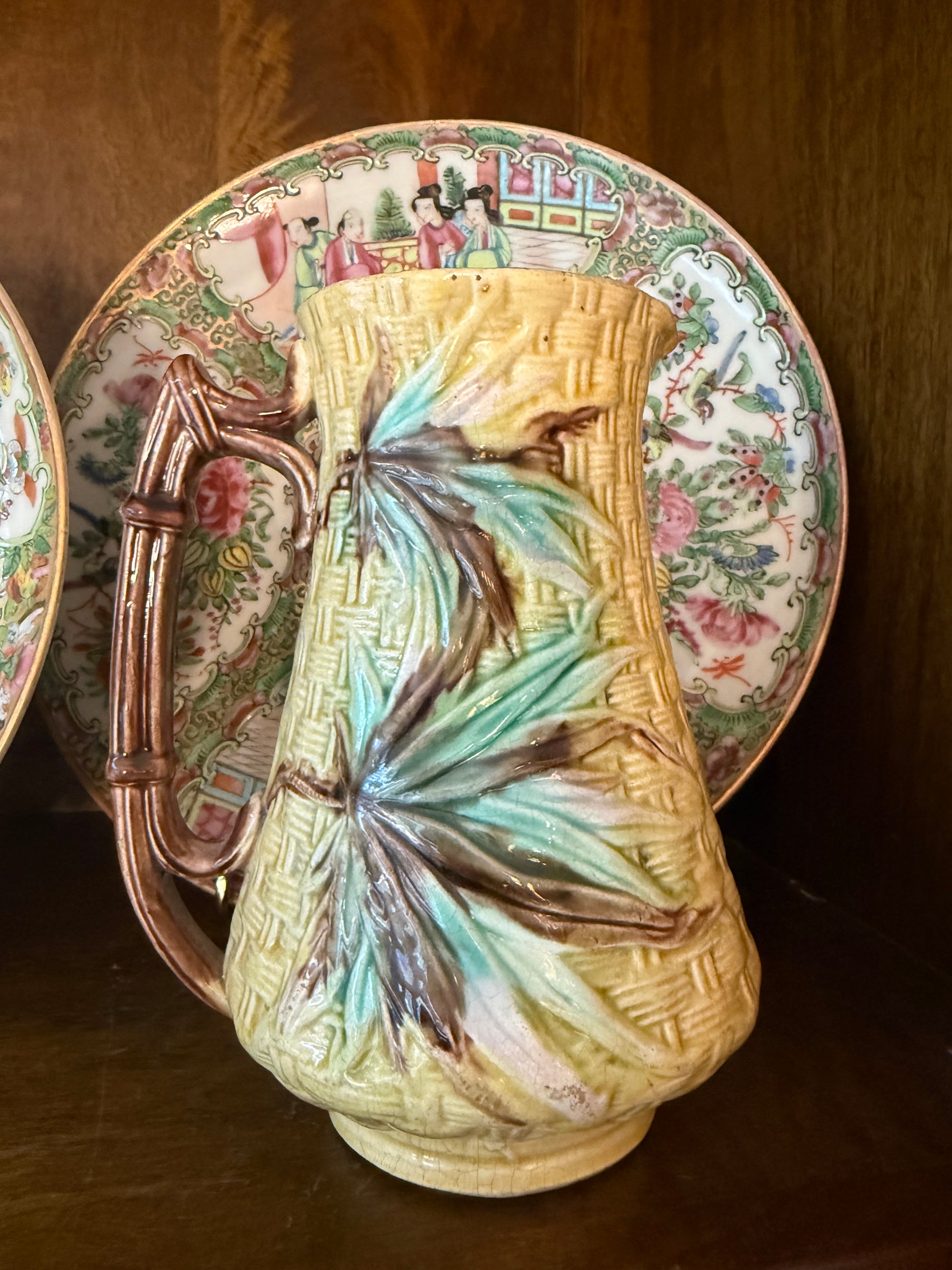 Antique English Majolica 6.5” Basketweave & Bamboo Pitcher by Banks & Thorley