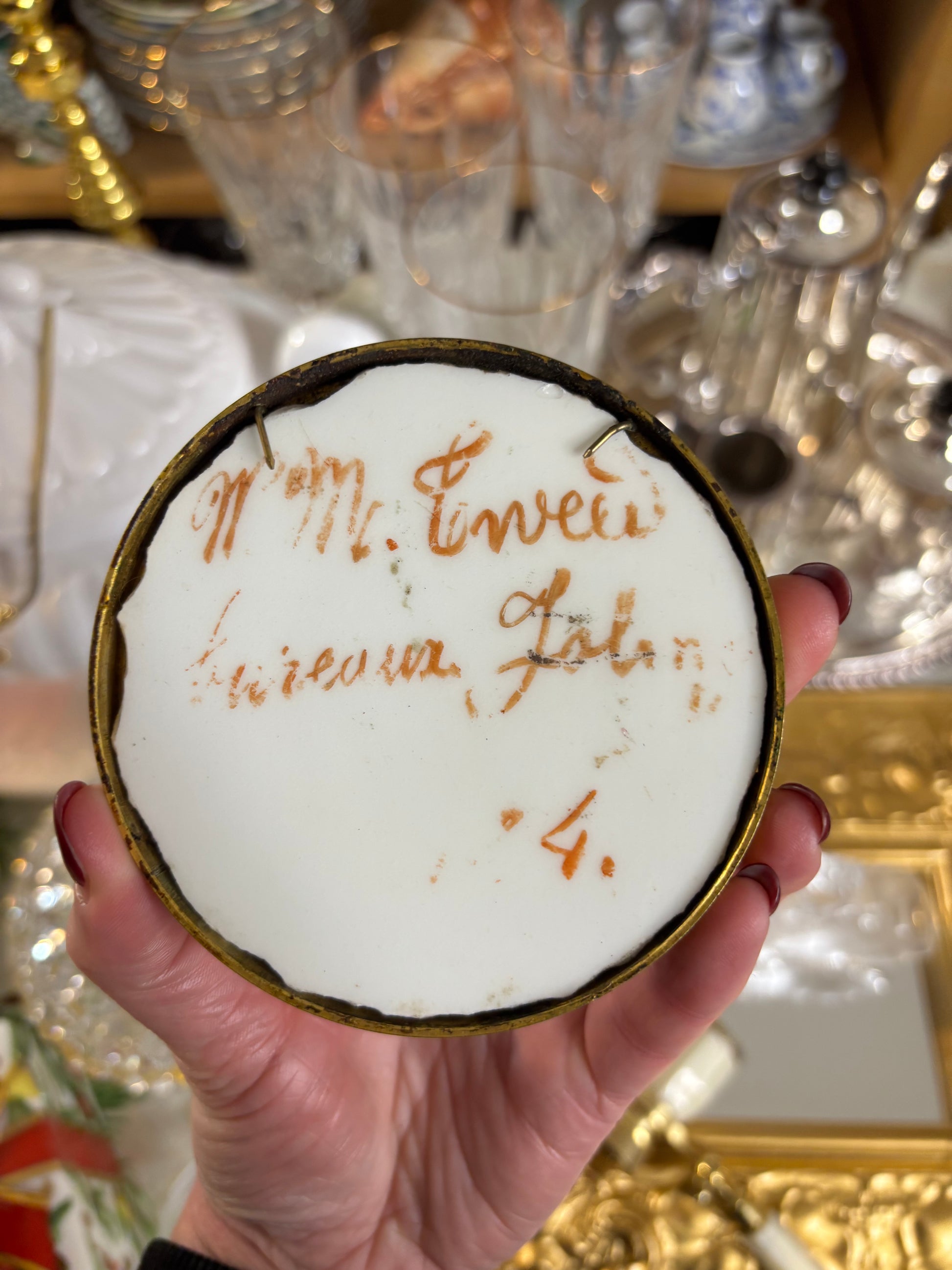 Gorgeous antique French porcelain painting! Signed on back. Edges have chipped but not visible in framed front. Measures 3 3/4”.