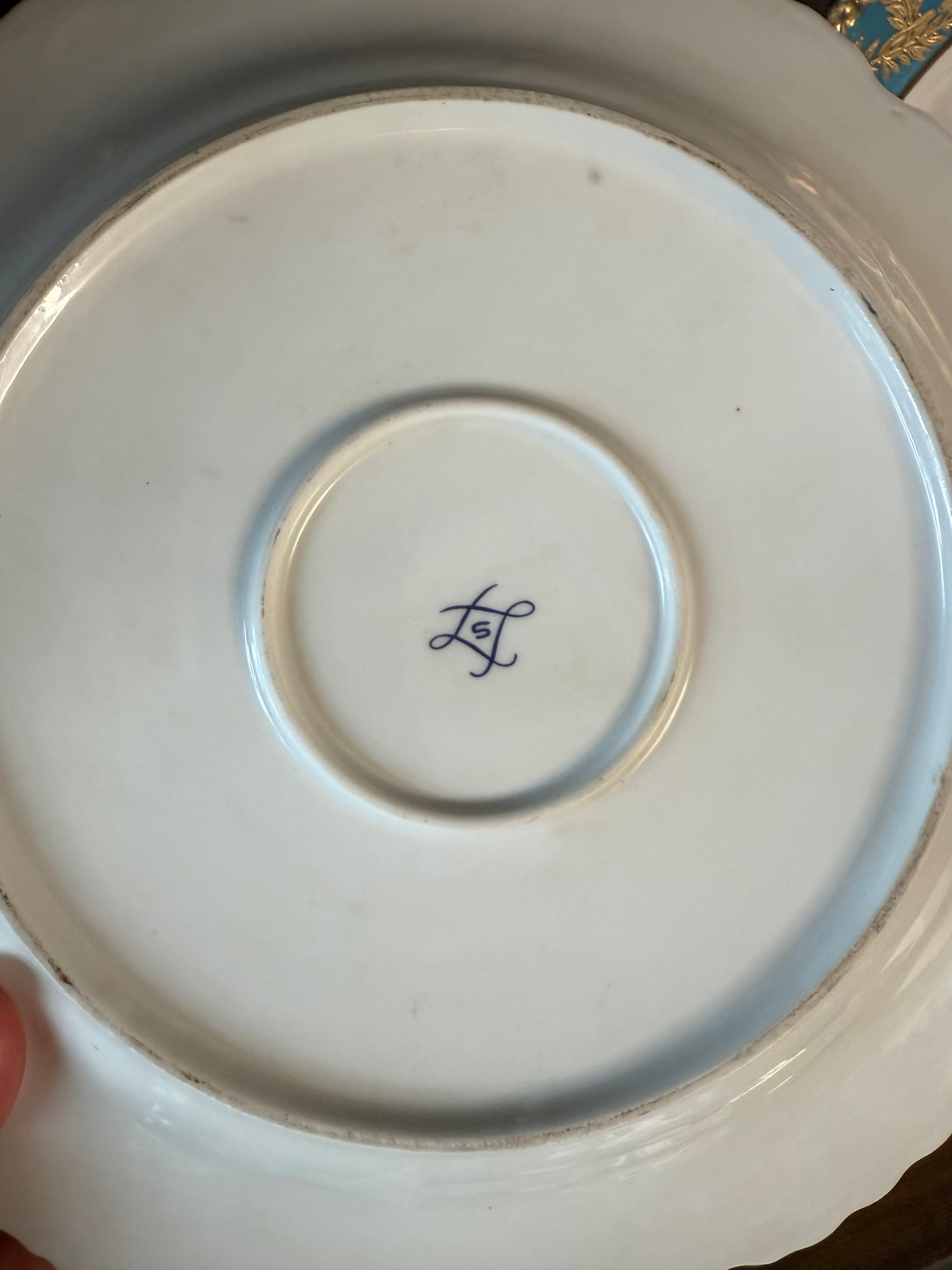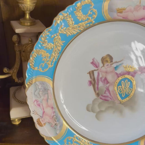 The plates features a turquoise “bleu céleste” ground & heavy raised gold gilt, cherubs & ornate borders with a central monogrammed shield. A fabulous addition to any collection!