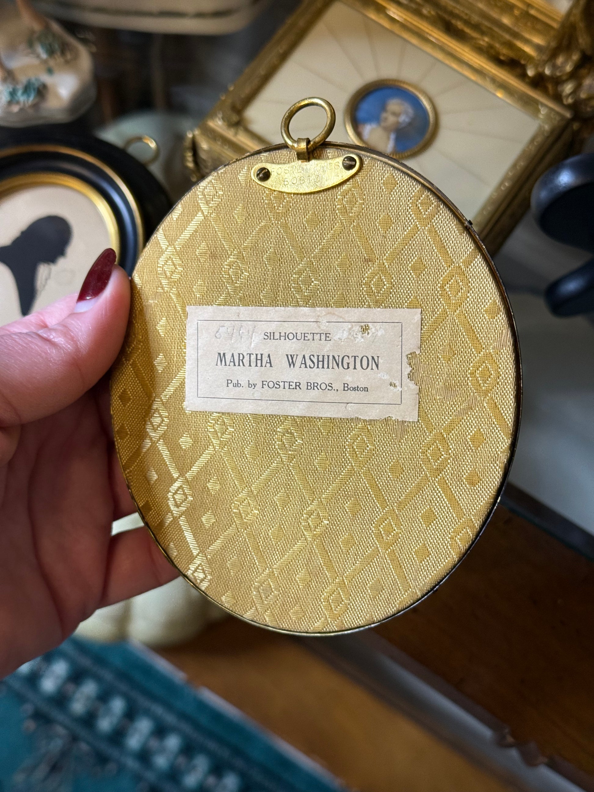 A distinguished pair of antique silhouette portraits depicting George and Martha Washington, created and framed by the renowned Foster Bros. of Boston, Massachusetts. Presented in their original black round frames with gilt liners and hanging loops, these finely rendered profiles capture America’s first President and First Lady in timeless simplicity.