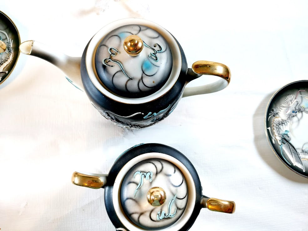 This vintage Japanese Moriage Dragonware tea set features a teapot, sugar bowl with lid, creamer, two cups, and two saucers, all in excellent condition. Beautiful gold on handles throughout entire collection. Showcasing the traditional slip-trailing technique, the set highlights intricate three-dimensional raised dragon motifs that are textured to the touch. The porcelain’s smoky black-to-gray gradient finish accentuates the dramatic, finely detailed designs, making it a distinguished collectible for enthusiasts of Japanese ceramics and artful tea service.