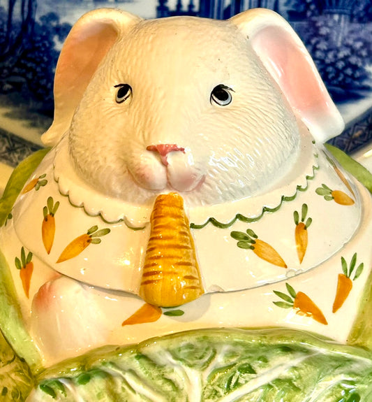 Ample bunny rabbit snuggled in cabbage cookie jar with lid