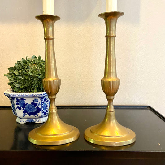Statuesque vintage aged matte brass tall pillar candlestick holders
