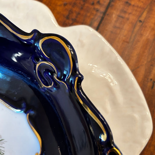 VINTAGE PORFIN CLUJ NAPOCA COBALT PINEAPPLE BOWL GILT FLORAL 10" ROMANIAN PORCELAIN